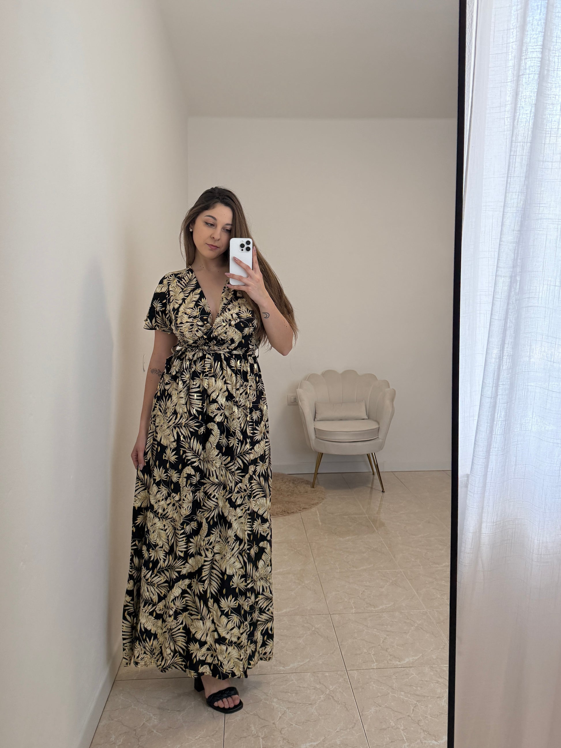 Abito lungo nero e oro a manica corta con elastico e laccetto in vita. Taglia unica, vestibilità fino ad una tg. 46.