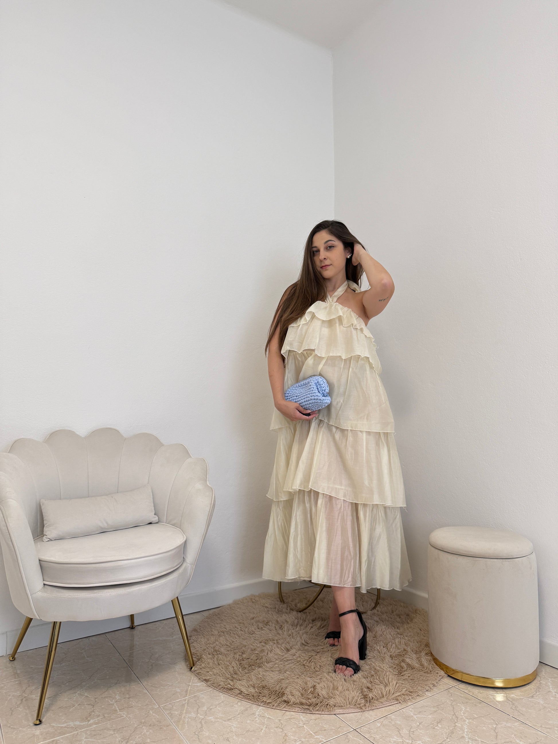 Abito giallo con balze, allacciatura dietro al collo. Taglia unica, vestibilità fino ad una tg. 46.