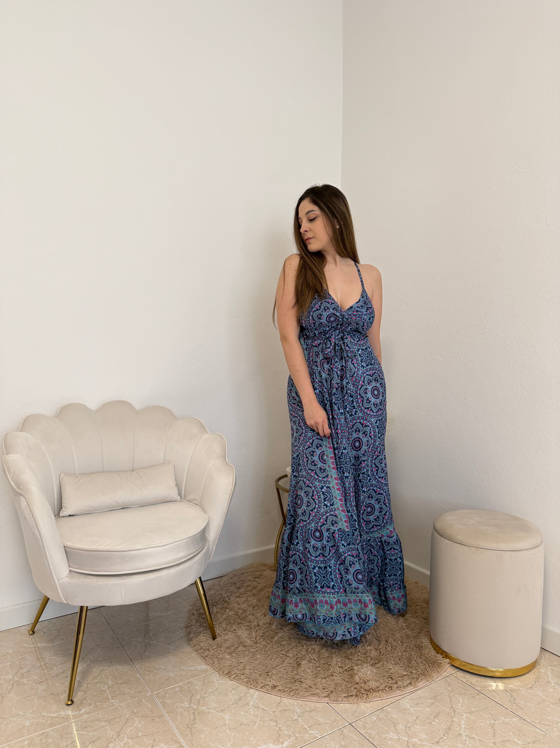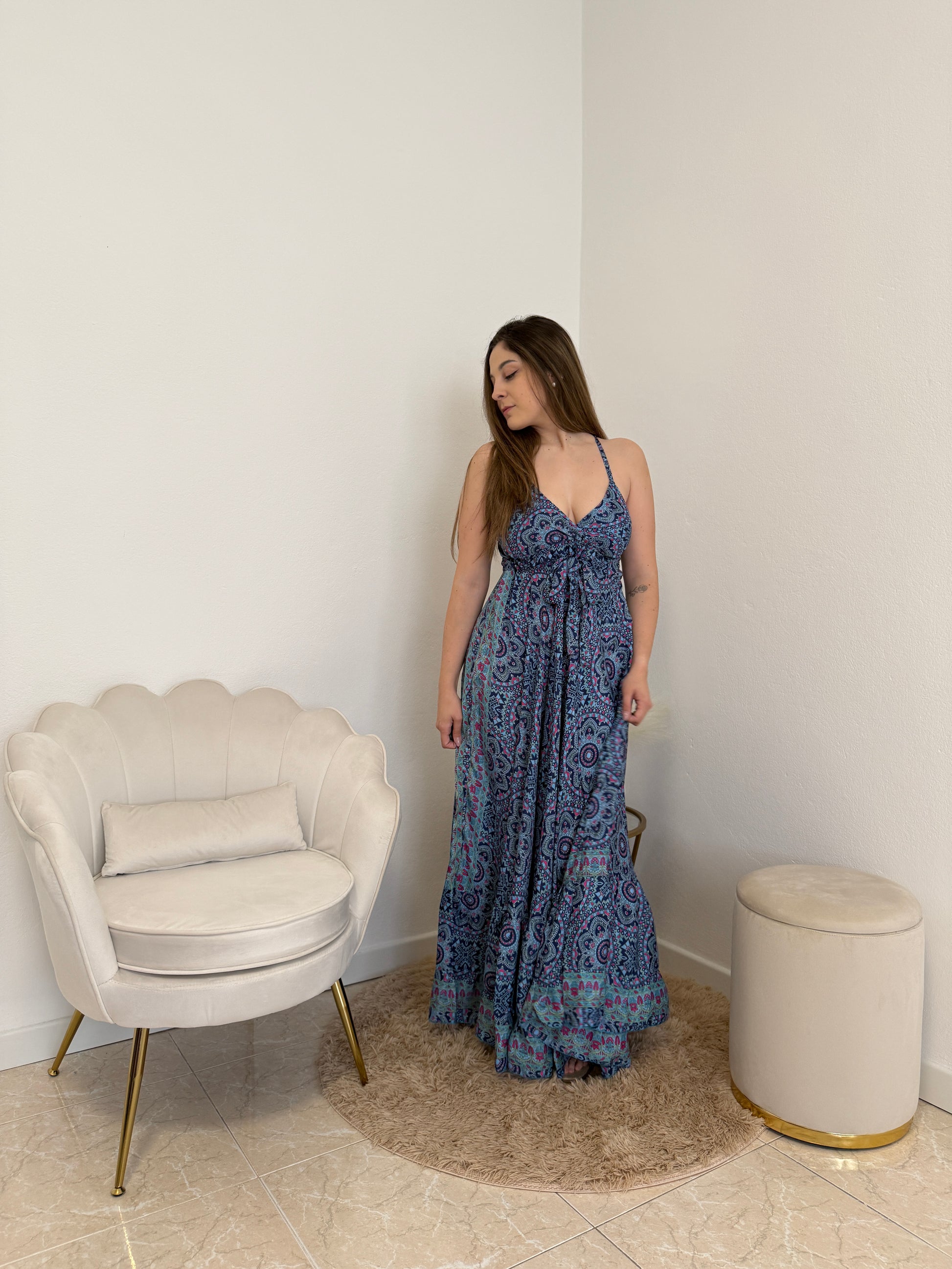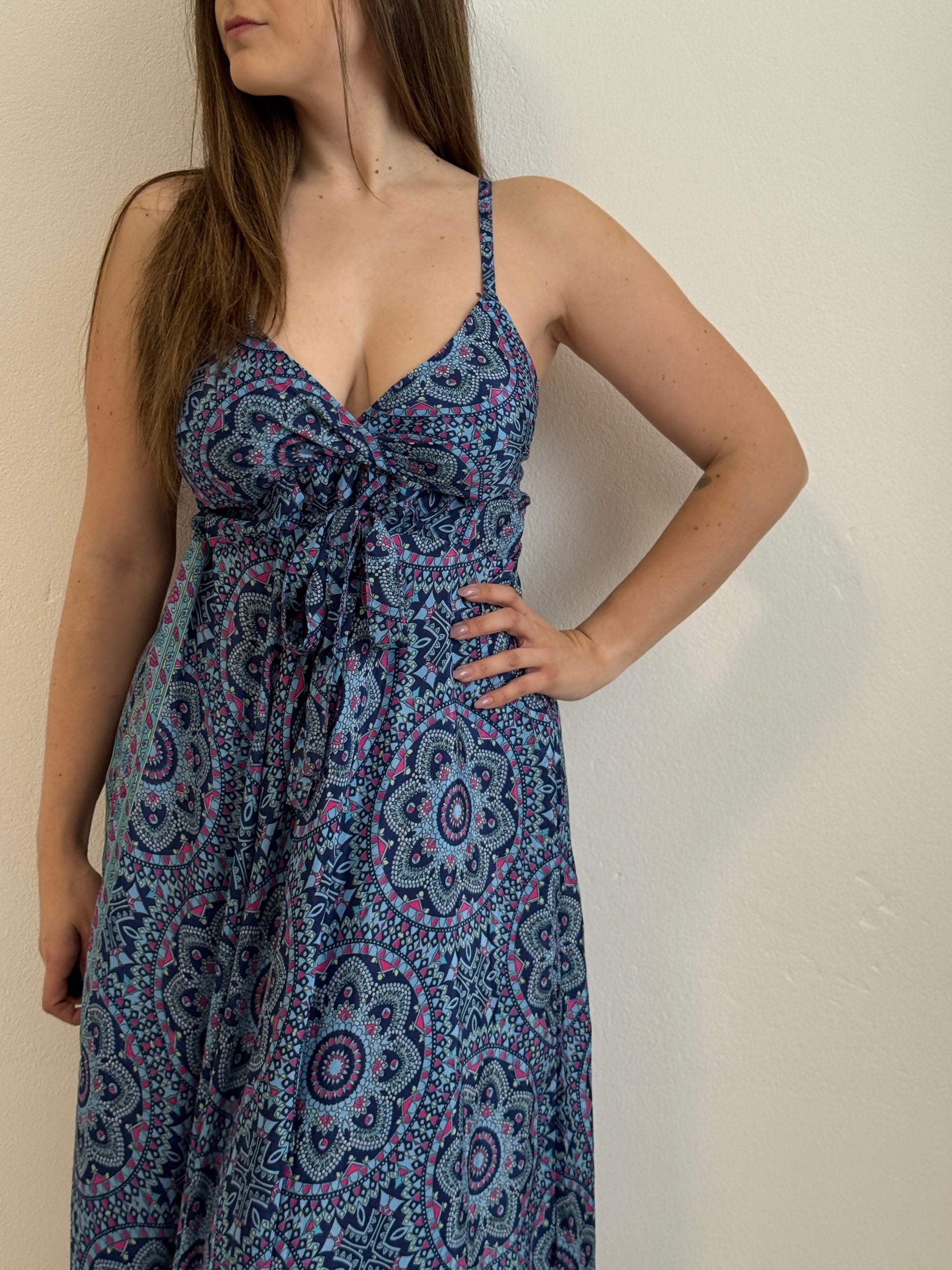Abito in fantasia con spalline regolabili e laccetto regolabile in vita, scollo a v. Taglia unica, vestibilità fino ad una tg. 44.