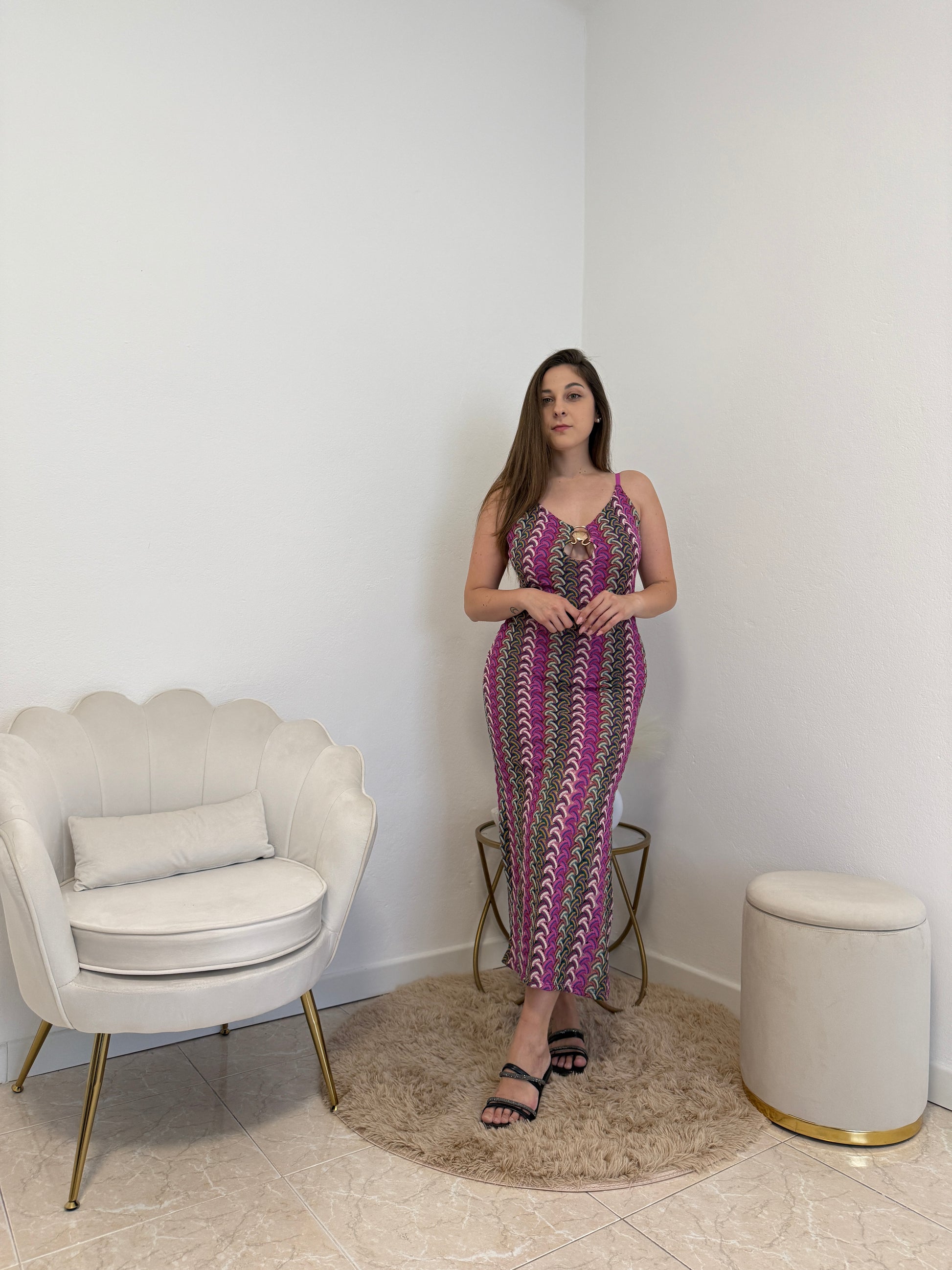 Abito lungo con cut out sul davanti e conchiglia dorata. Taglia unica, vestibilità fino ad una tg. 44.