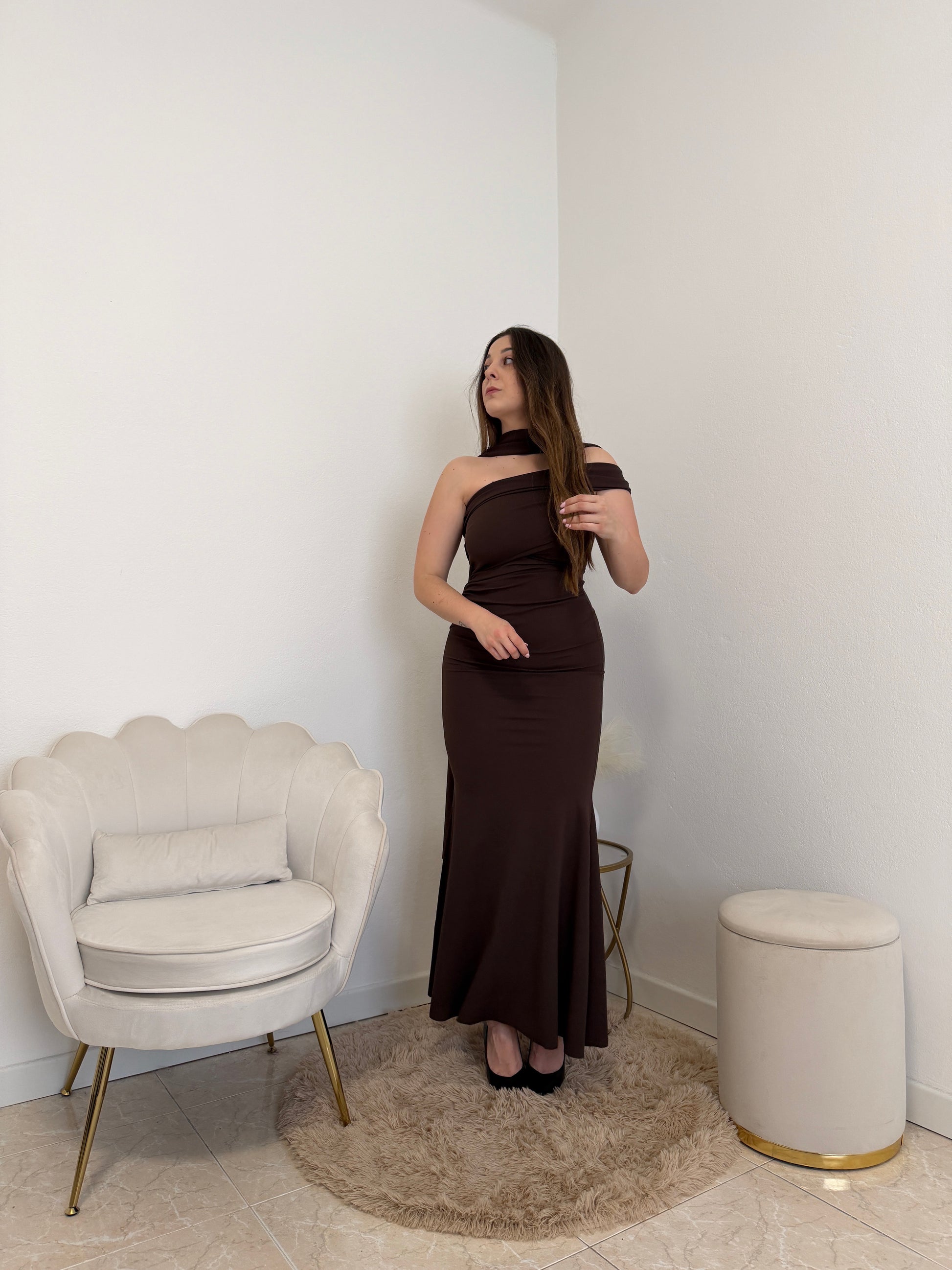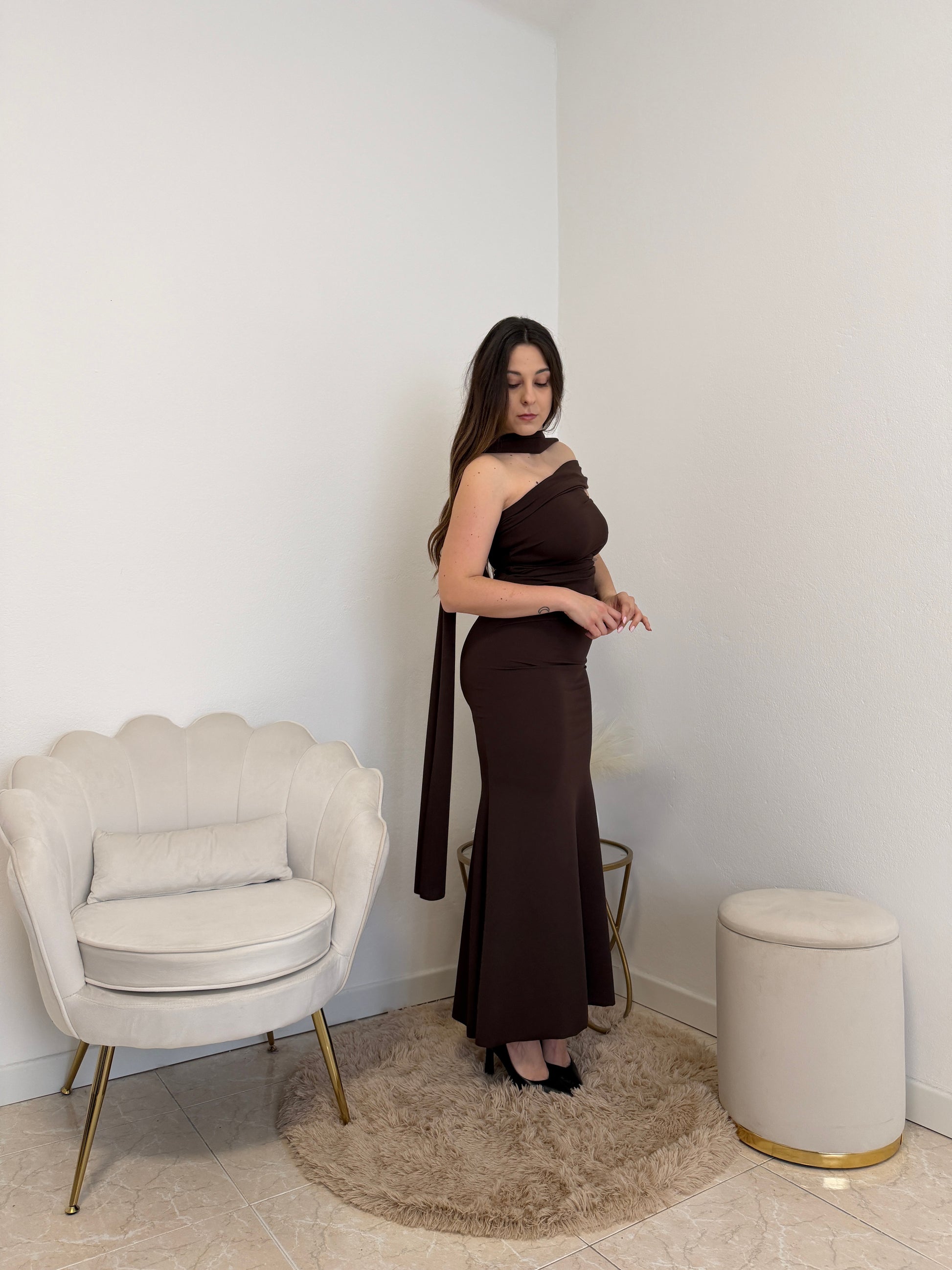 Abito a sirena con scollo asimmetrico. Taglia unica, vestibilità aderente fino ad una tg. 44.