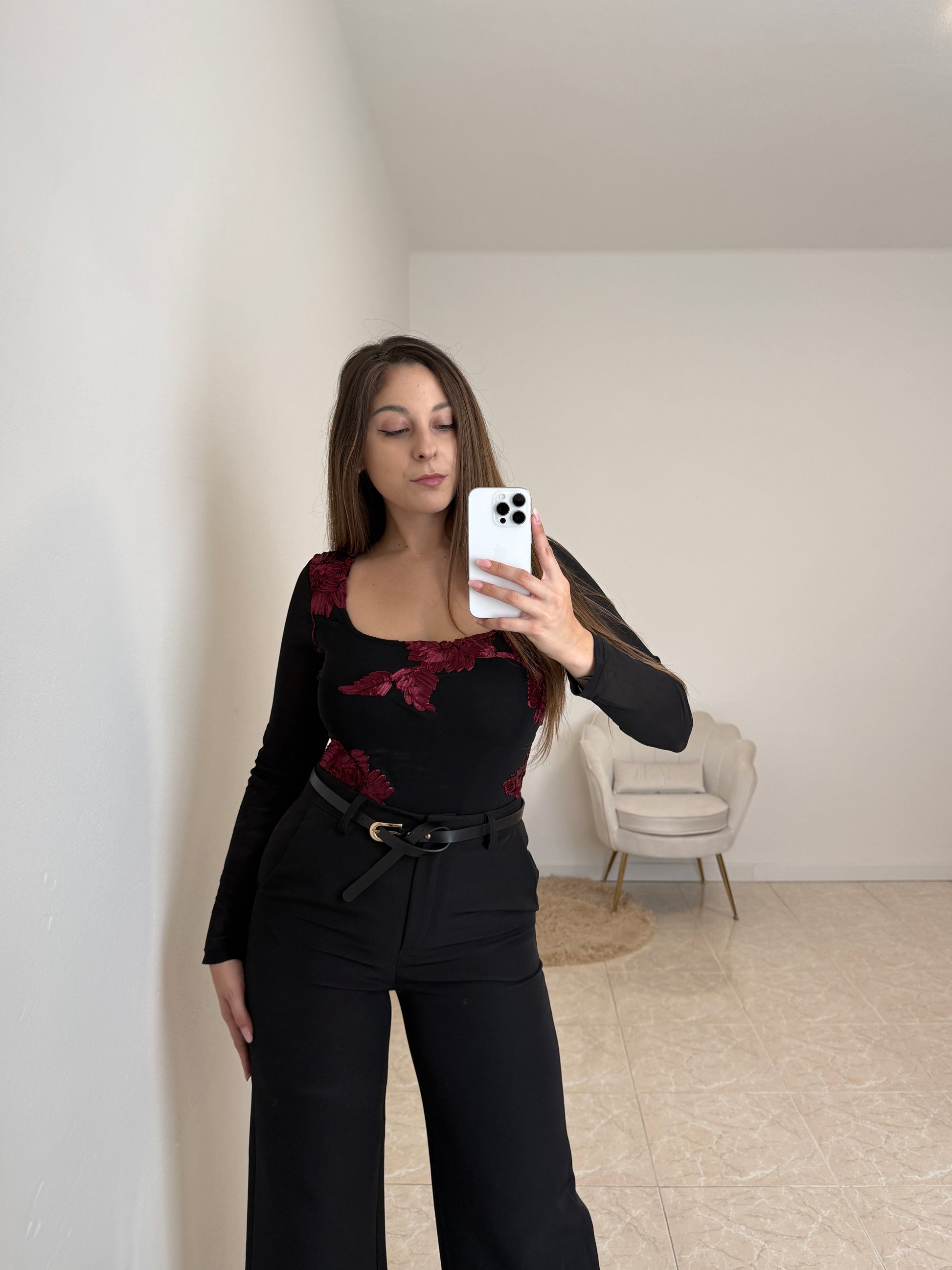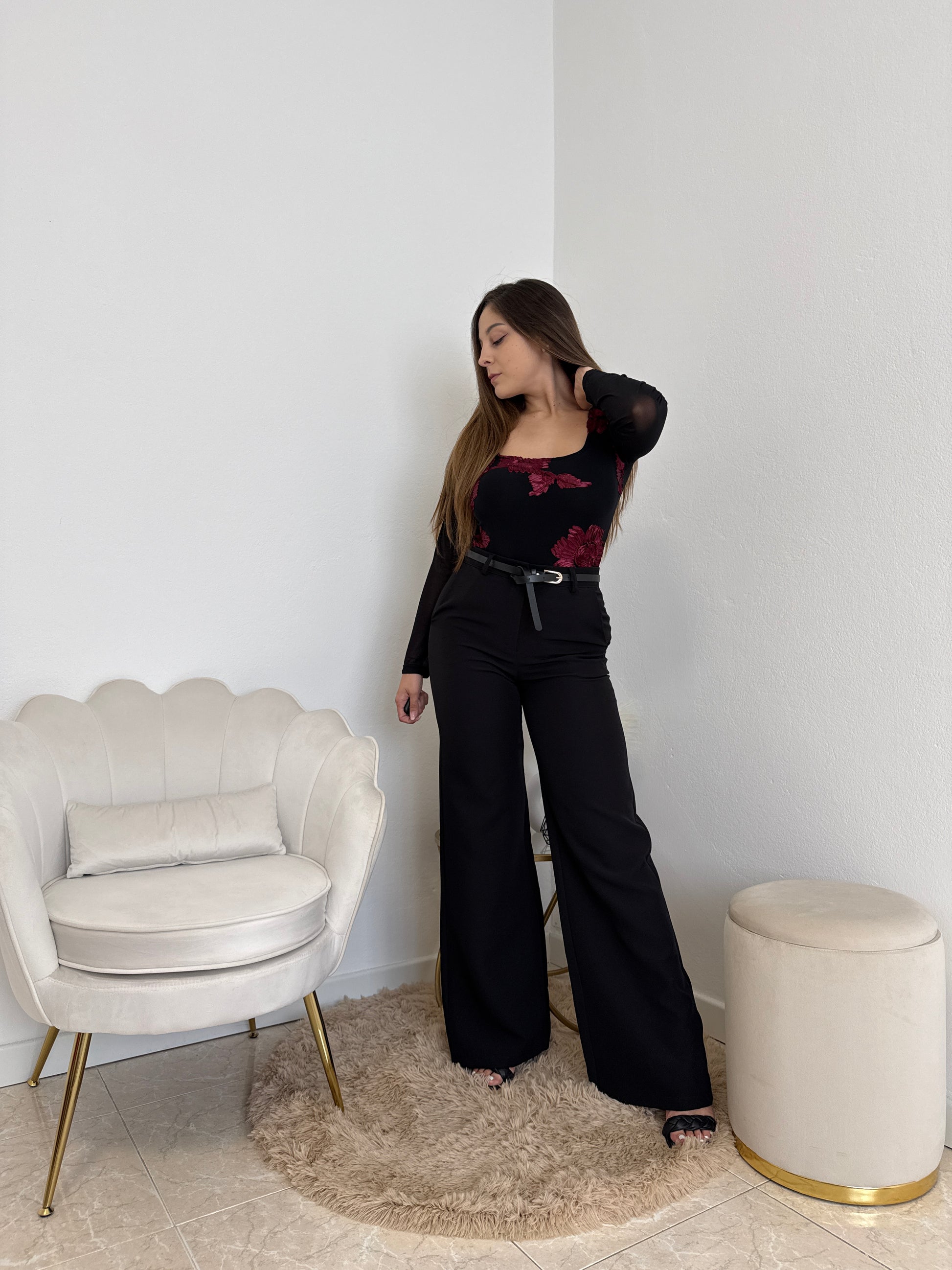 Body nero a maniche lunghe con fiori bordeuax sul fronte, schiena e maniche velate. Taglia unica, vestibilità fino ad una tg. 44.