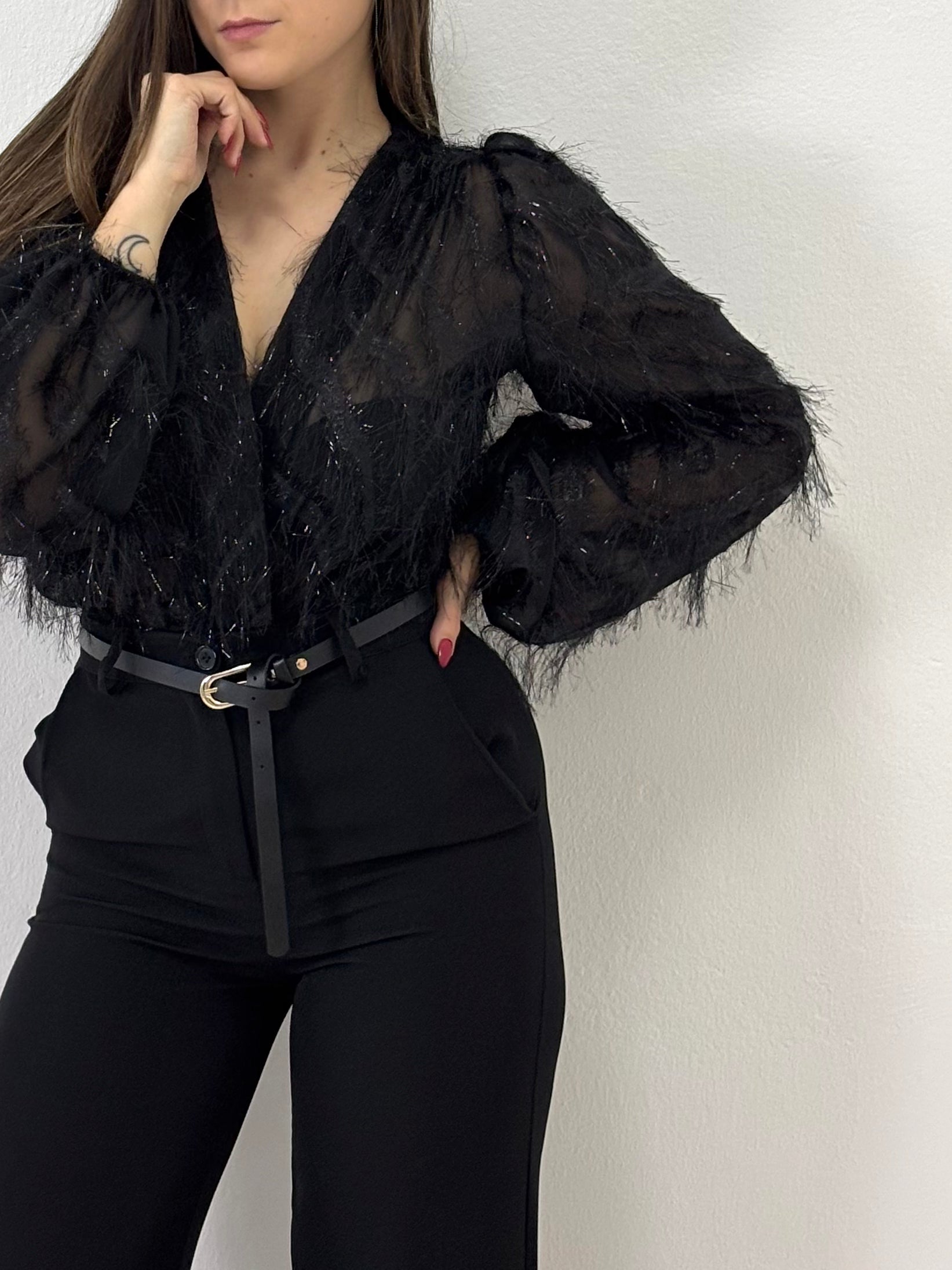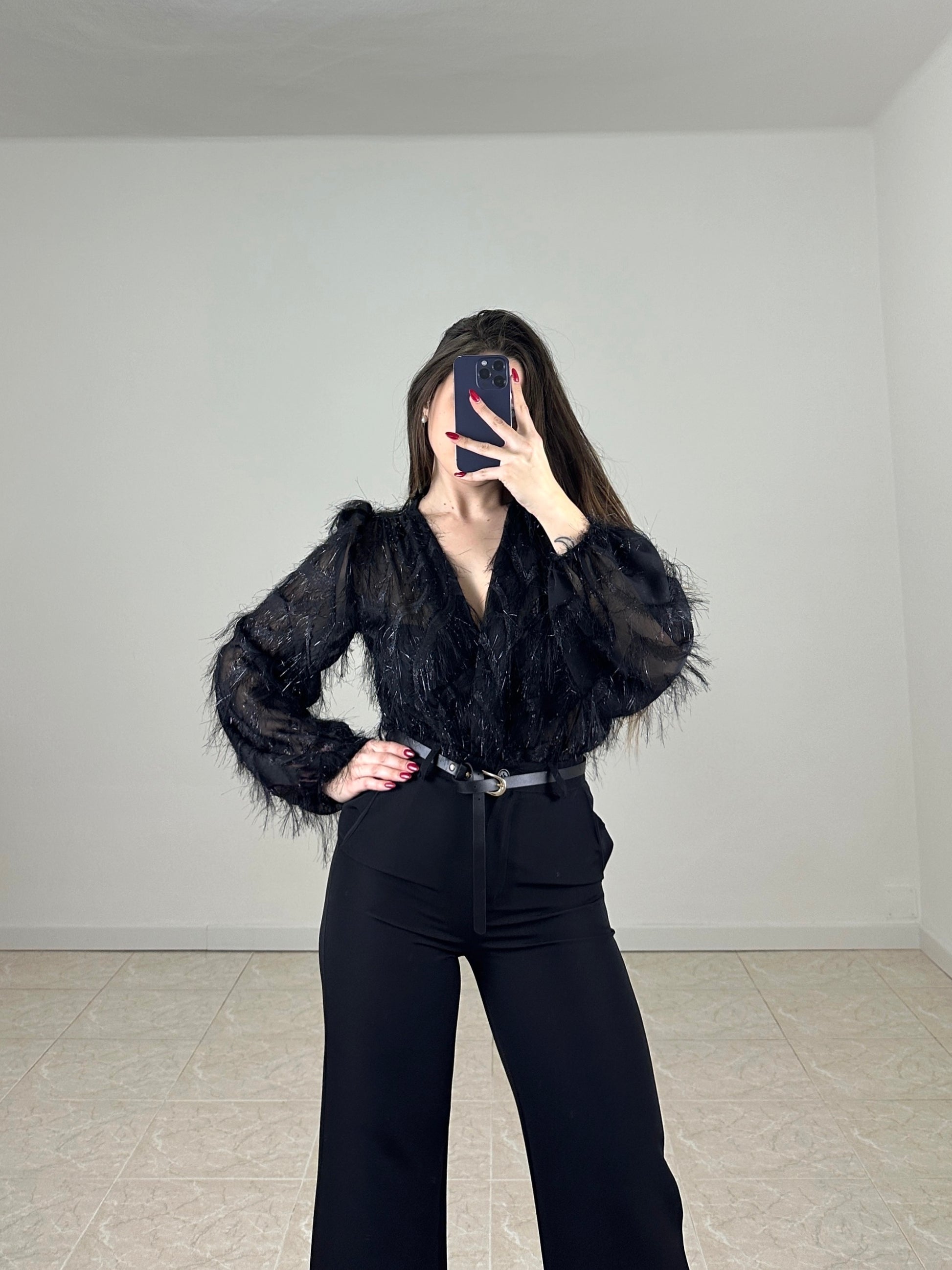 Body nero semi trasparente con frangette nere e argento, maniche a palloncino. Taglia unica, vestibilità fino ad una tg. 44.