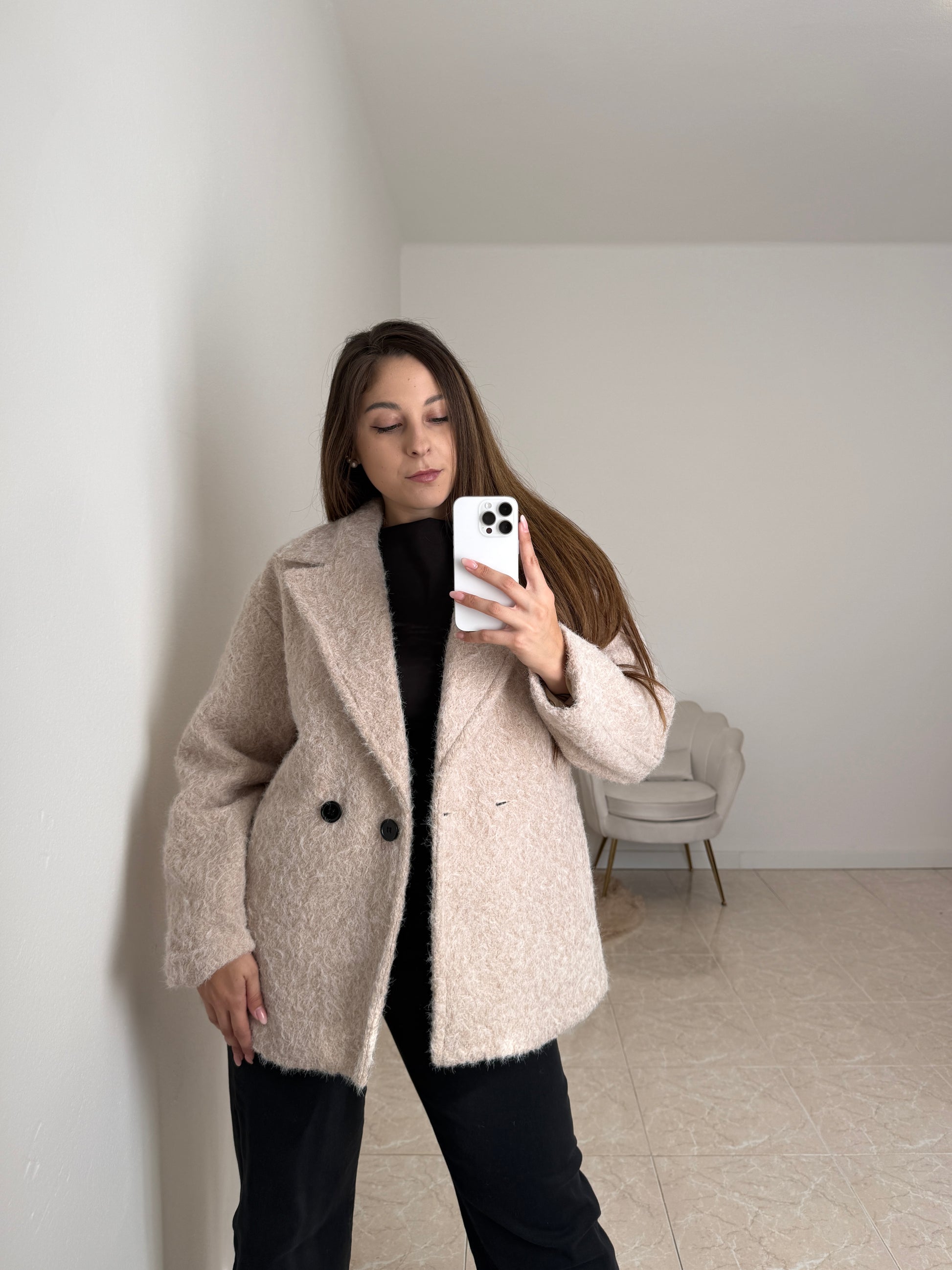 Cappotto foderato a chiusura doppio petto con bottoncini neri. Taglia unica, vestibilità fino ad una tg. 46.