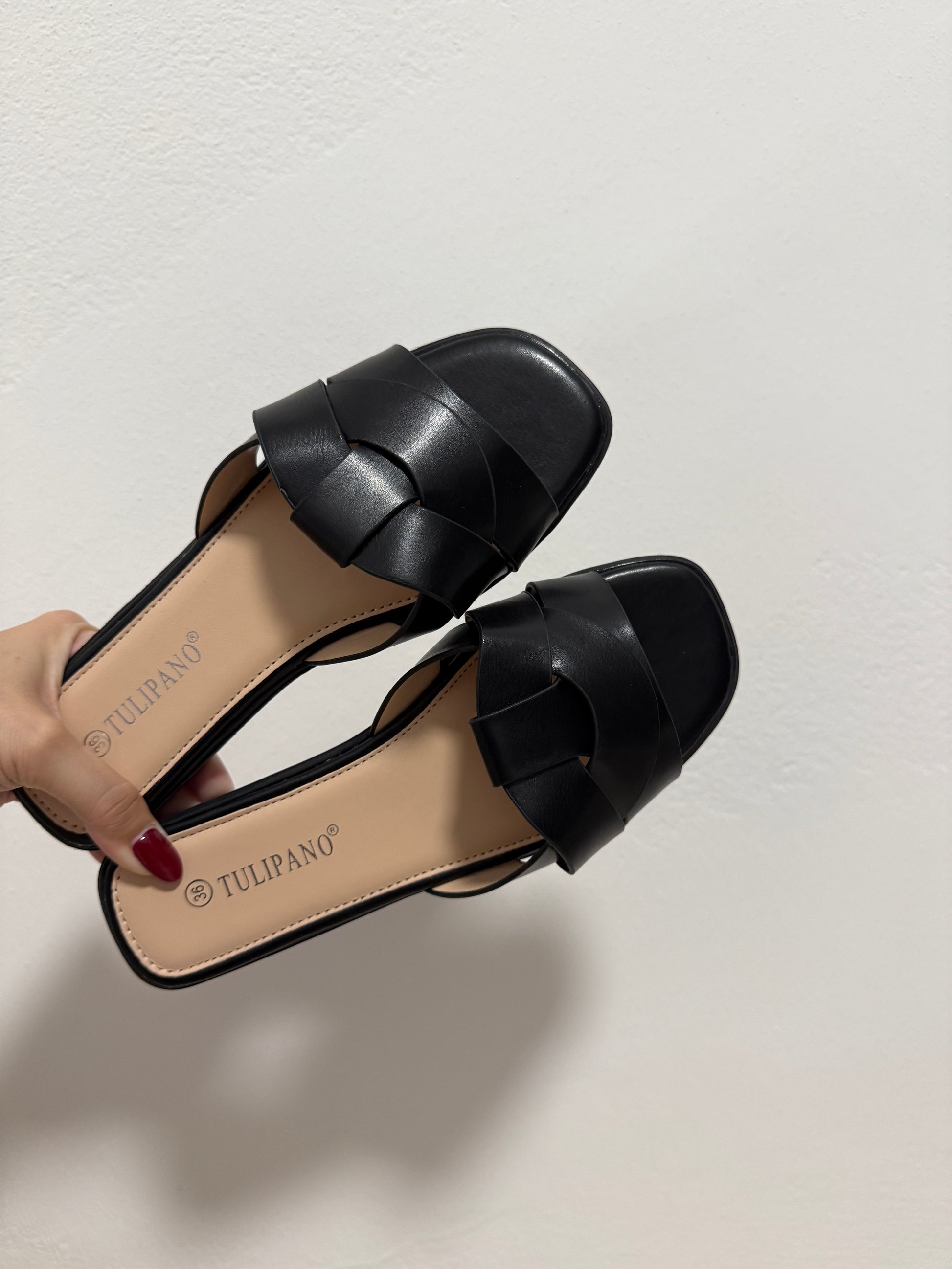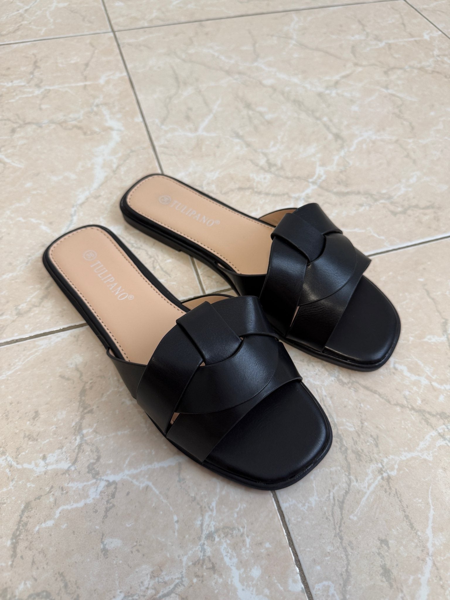Ciabatta in ecopelle nera con intreccio sul davanti. Calzata regolare.