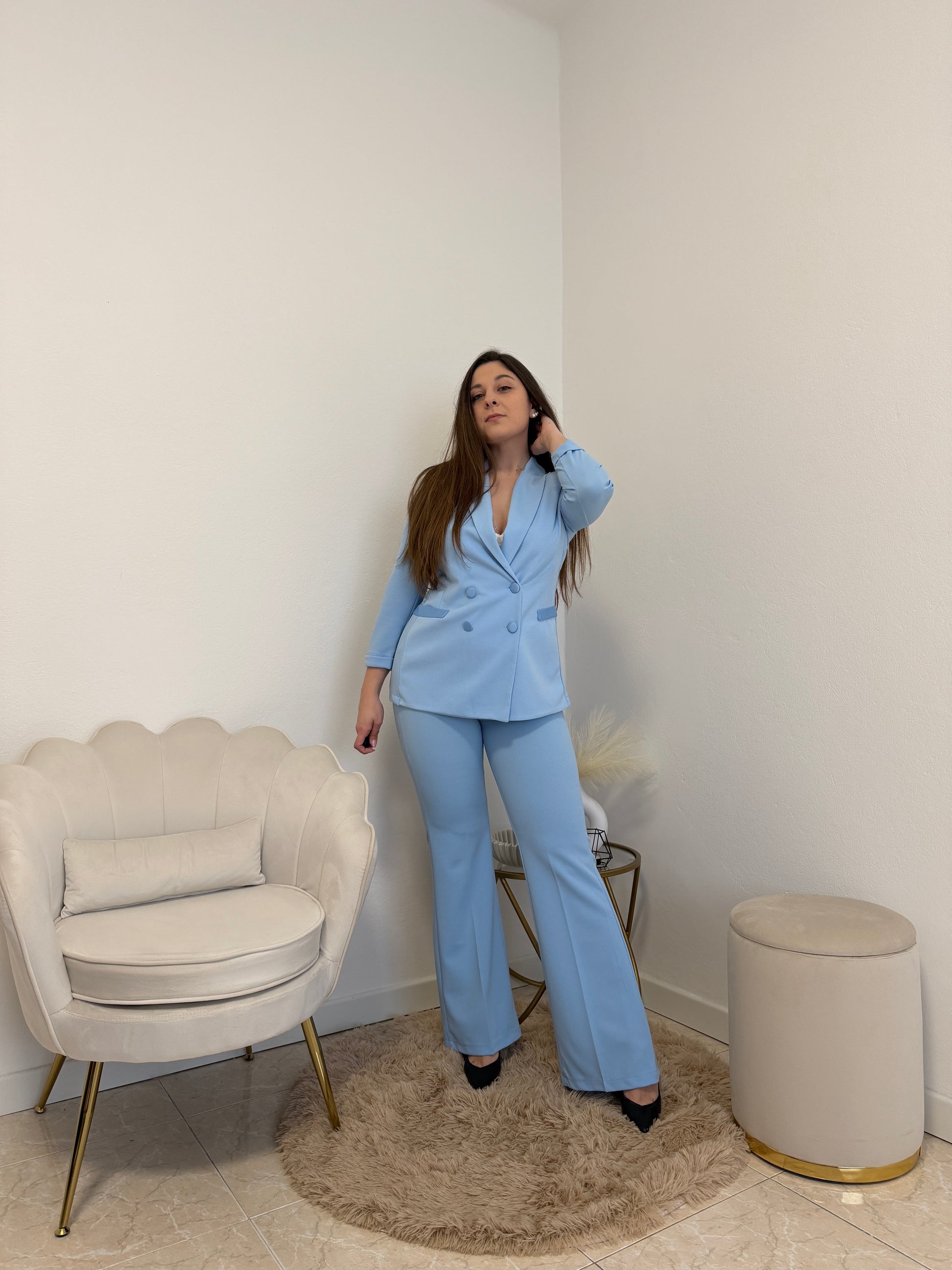 Completo con inserti in raso composto da giacca a doppiopetto e pantalone a zampa.