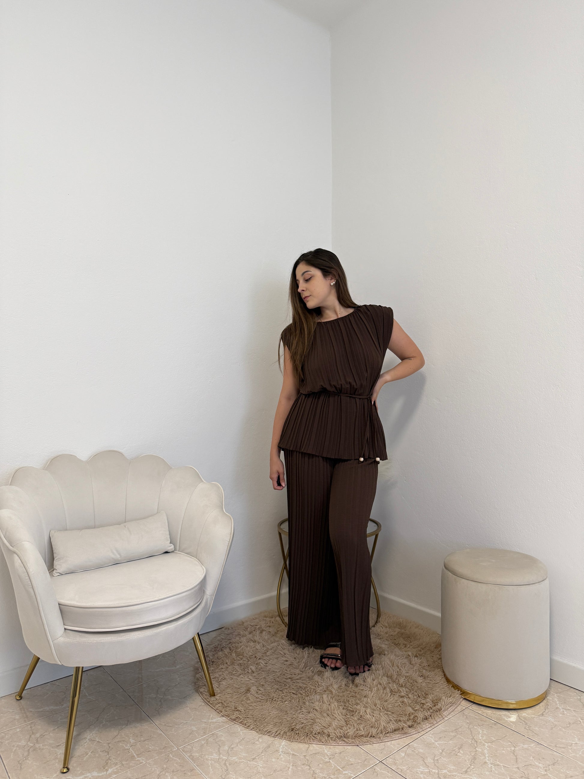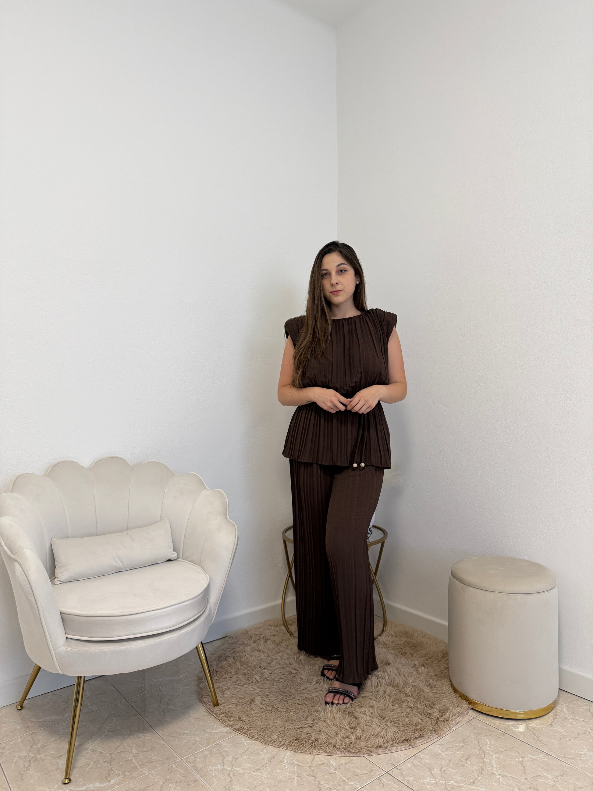 Completo plissettato con spalline bombate e laccetto regolabile in vita. Taglia unica, vestibilità fino ad una tg. 48.