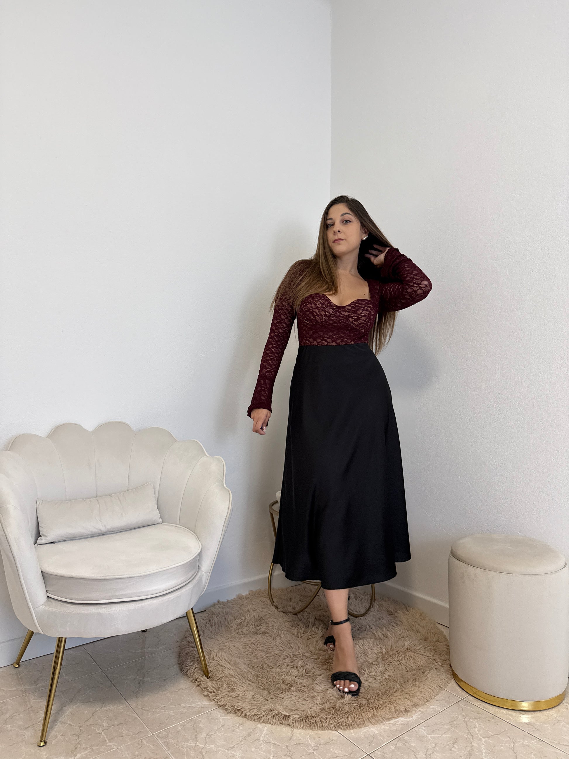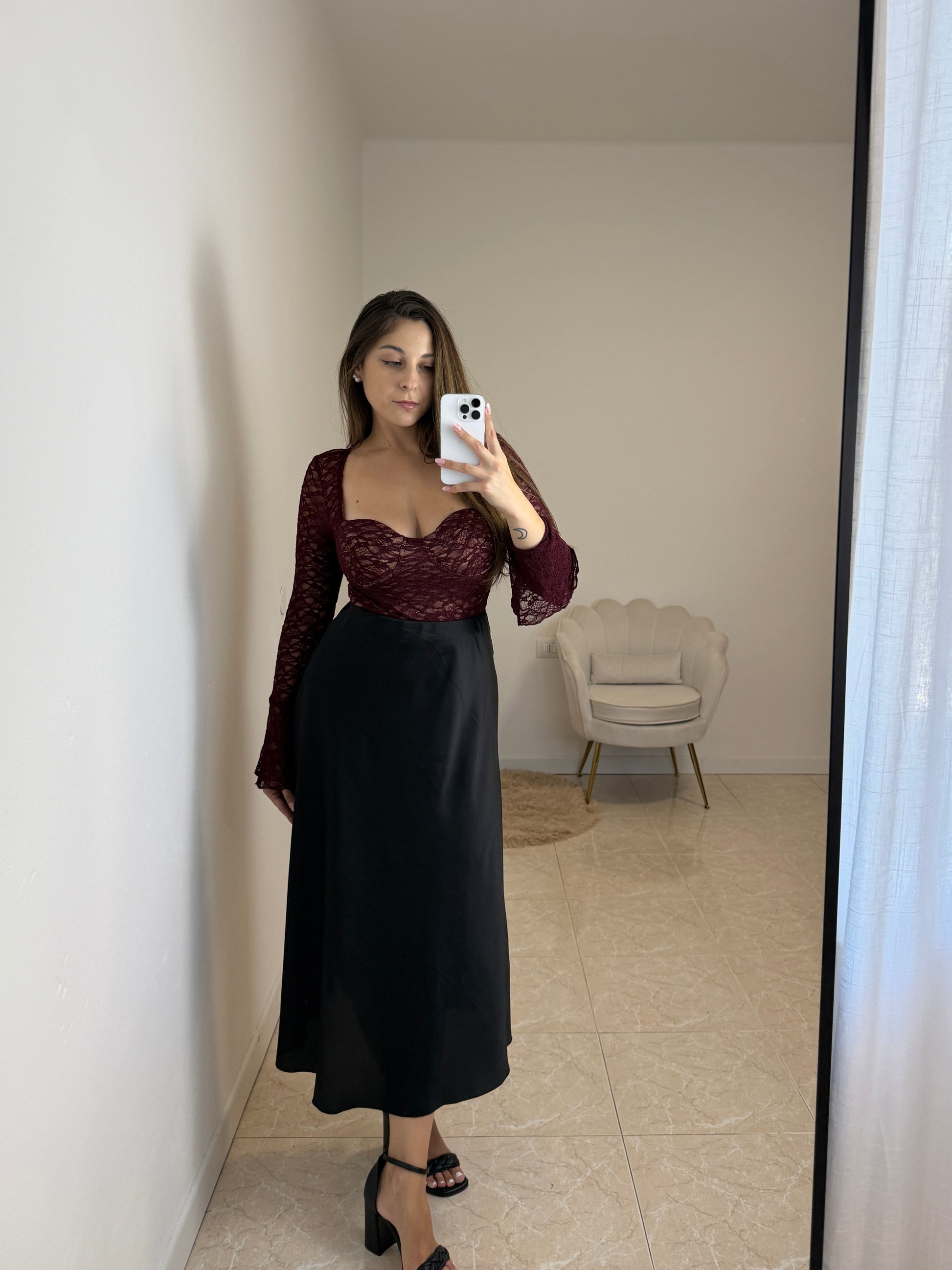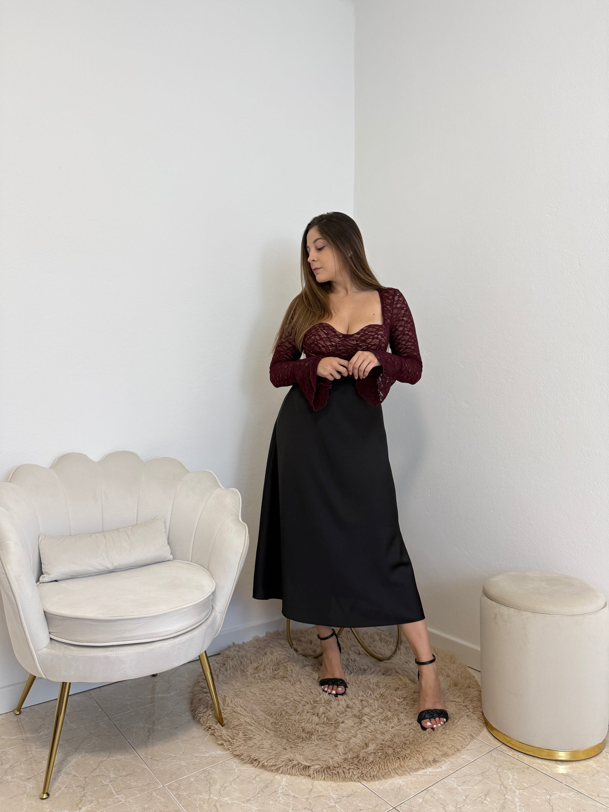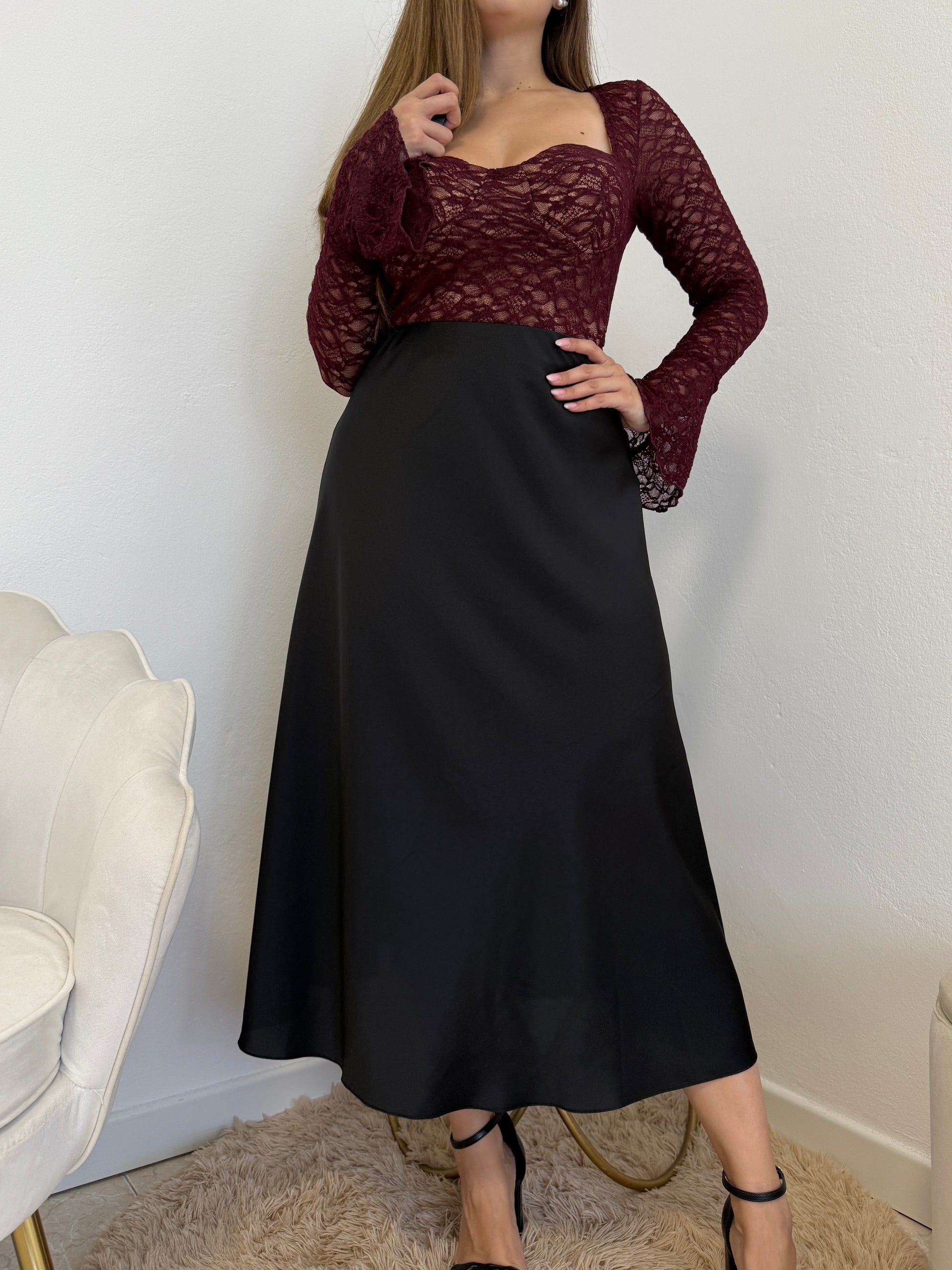 Gonna lunga in simil raso satinata con elastico in vita. Taglia unica, vestibilità fino ad una tg. 44.