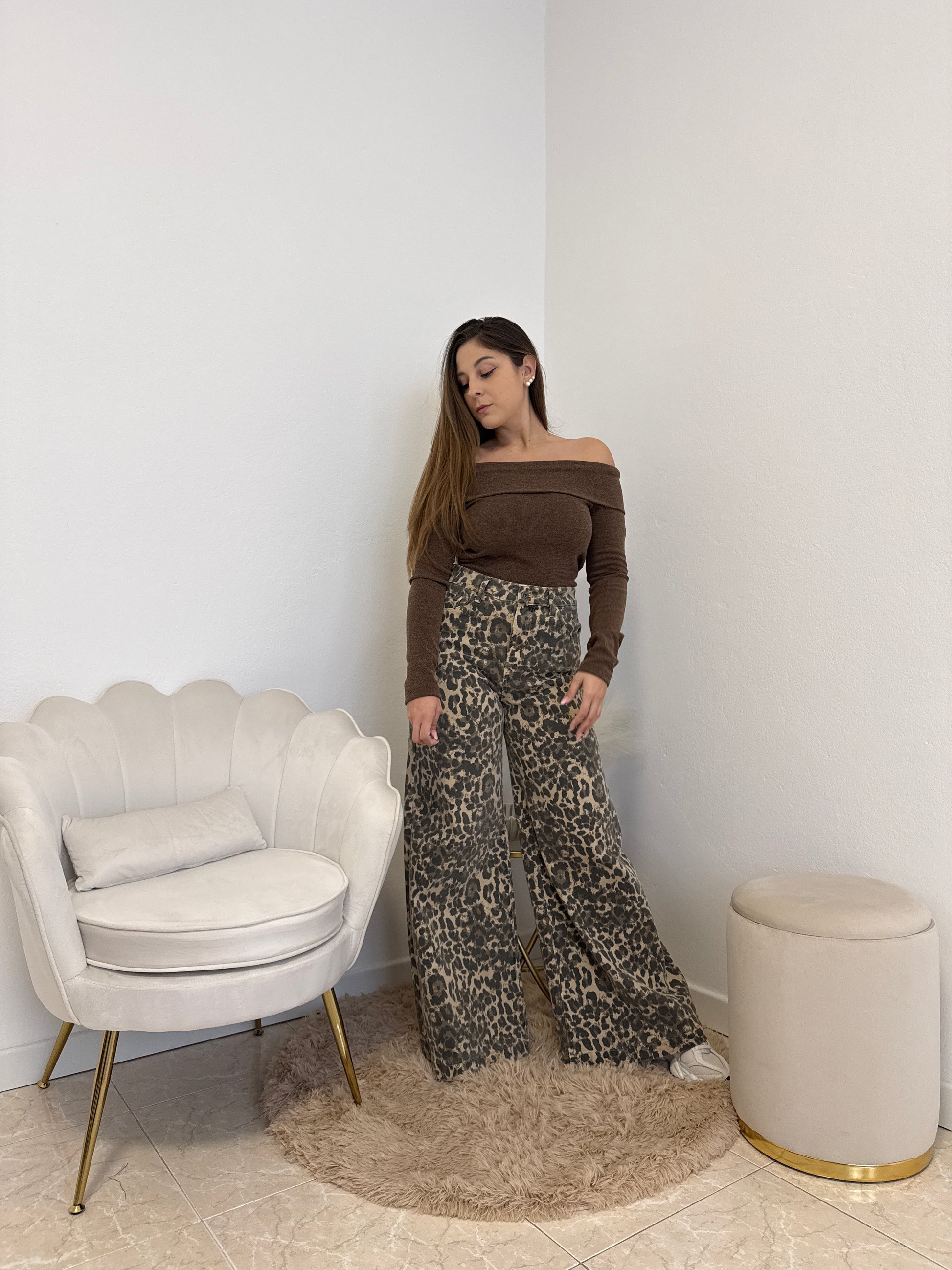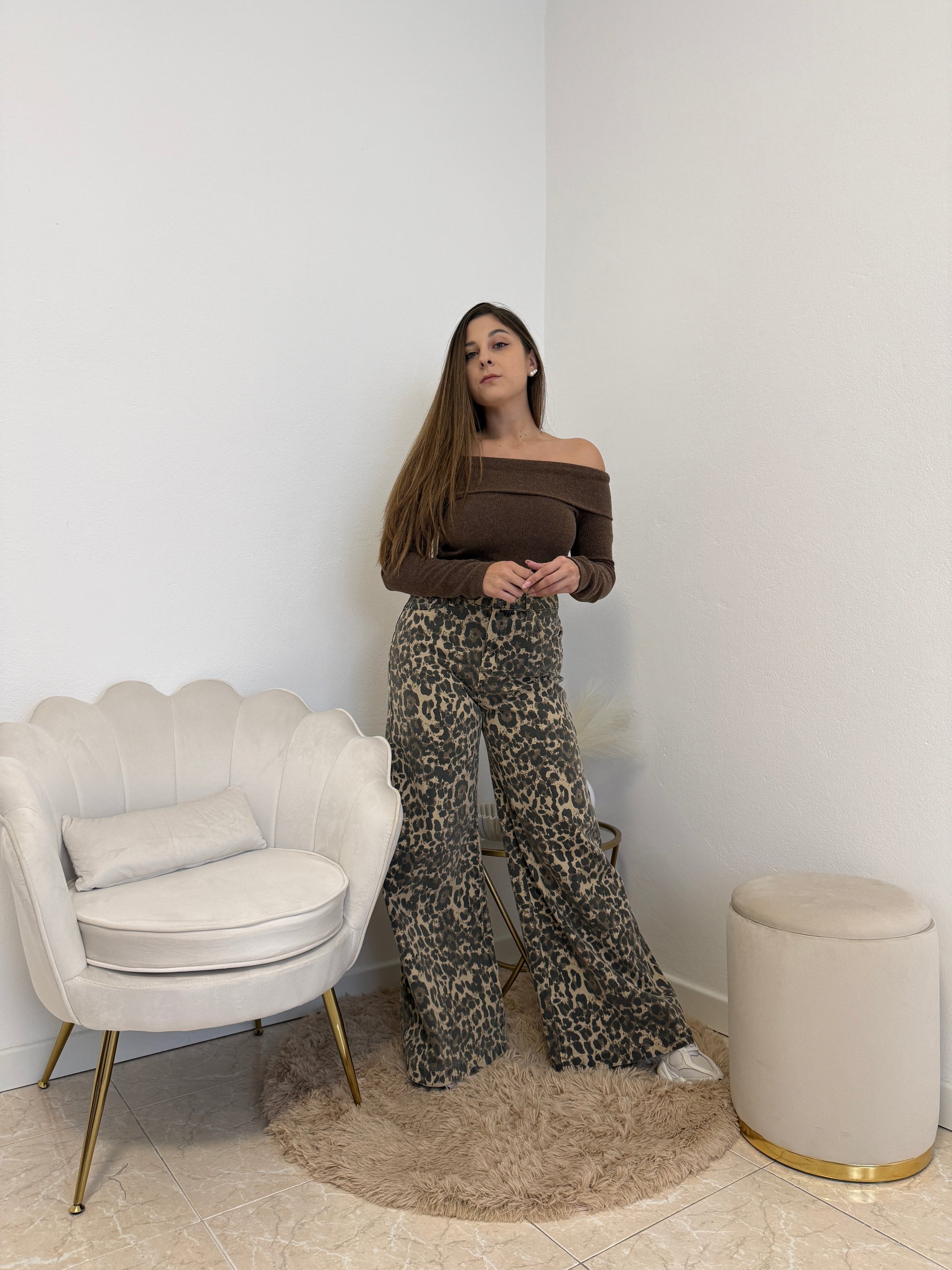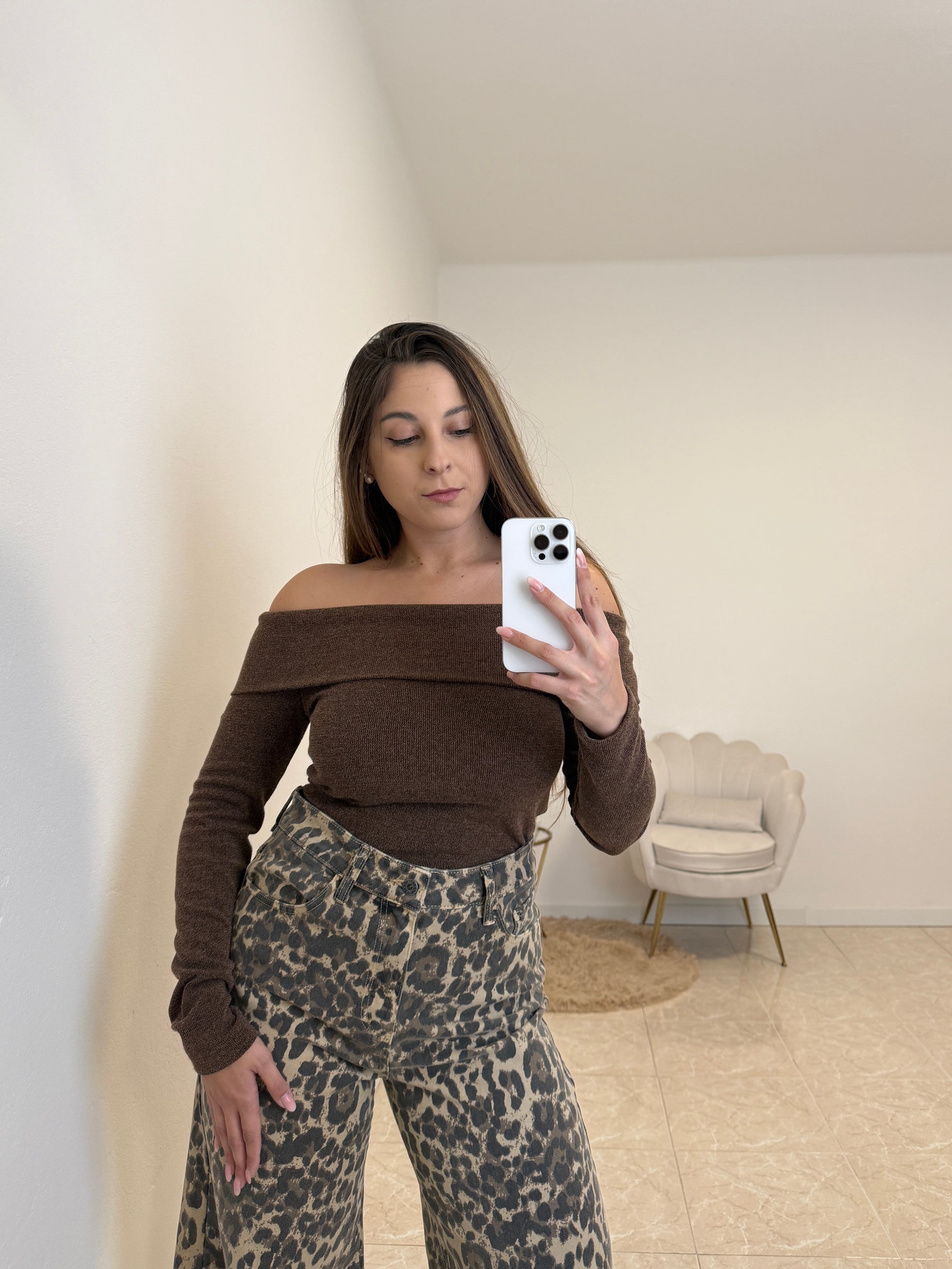 Maglia a maniche lunghe color cioccolato con scollo a barca, marca Lumina.