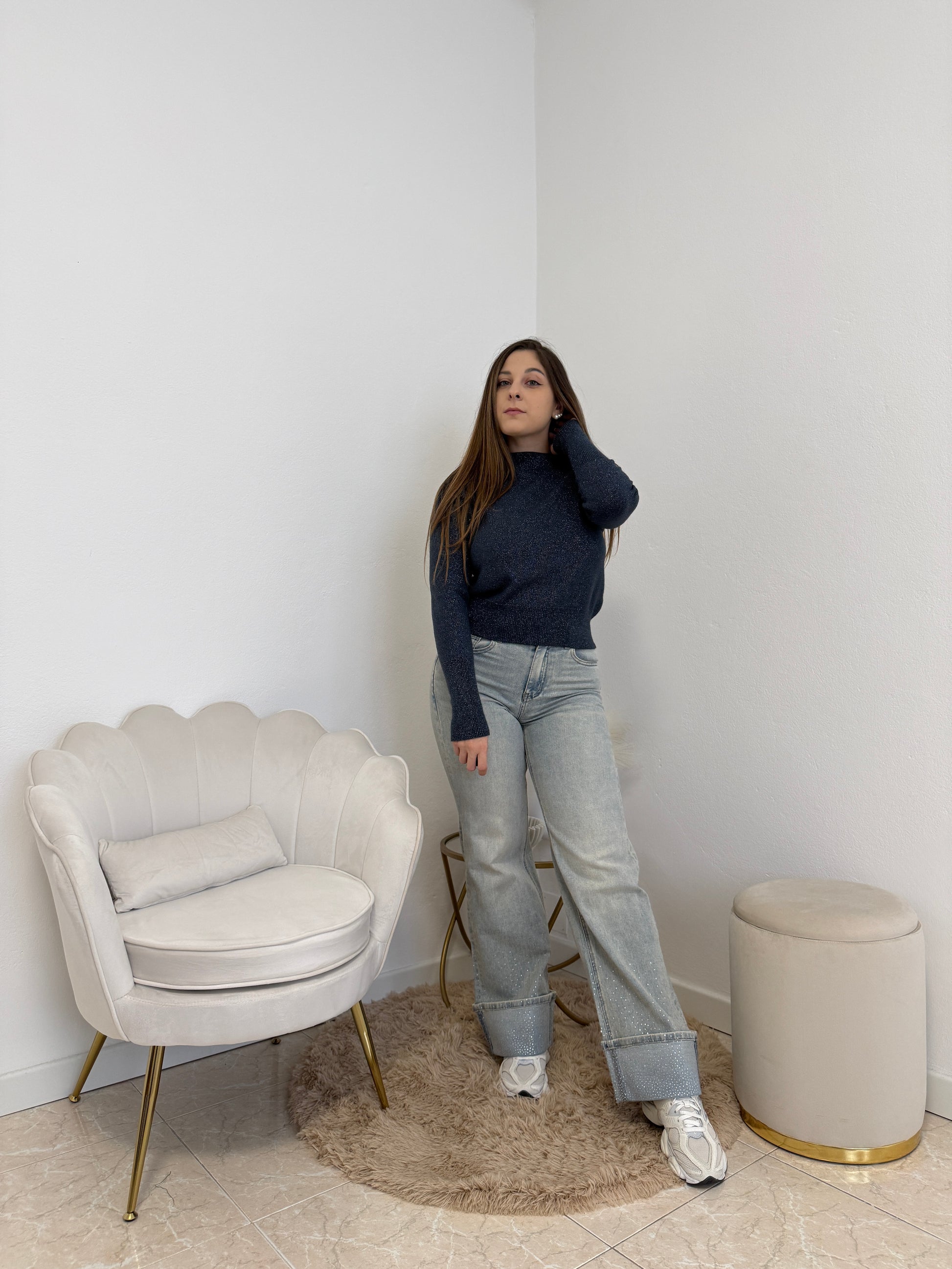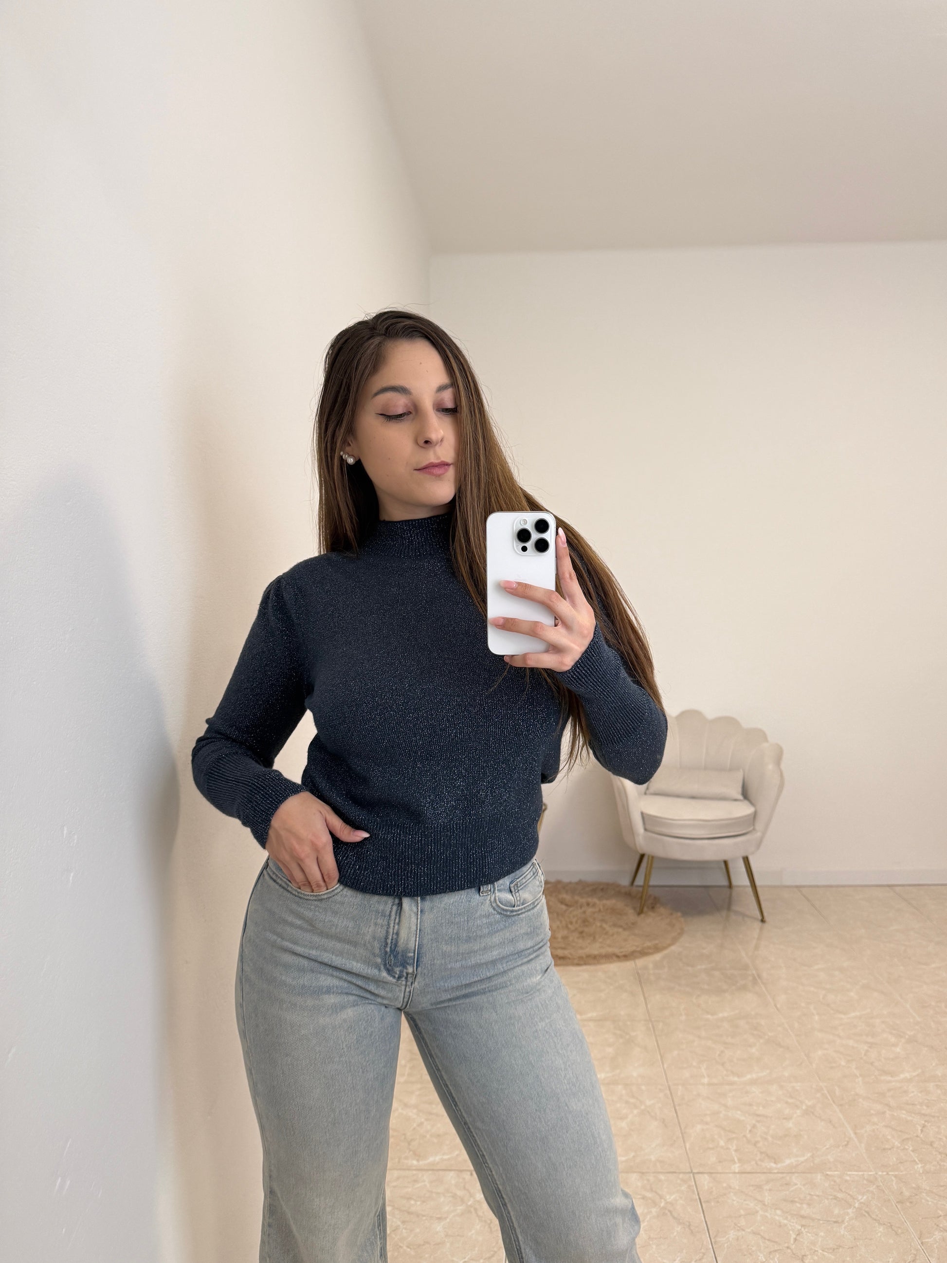 Maglioncino in lurex con arricciatura sulle spalle. Taglia unica, vestibilità fino ad una tg. 44.
