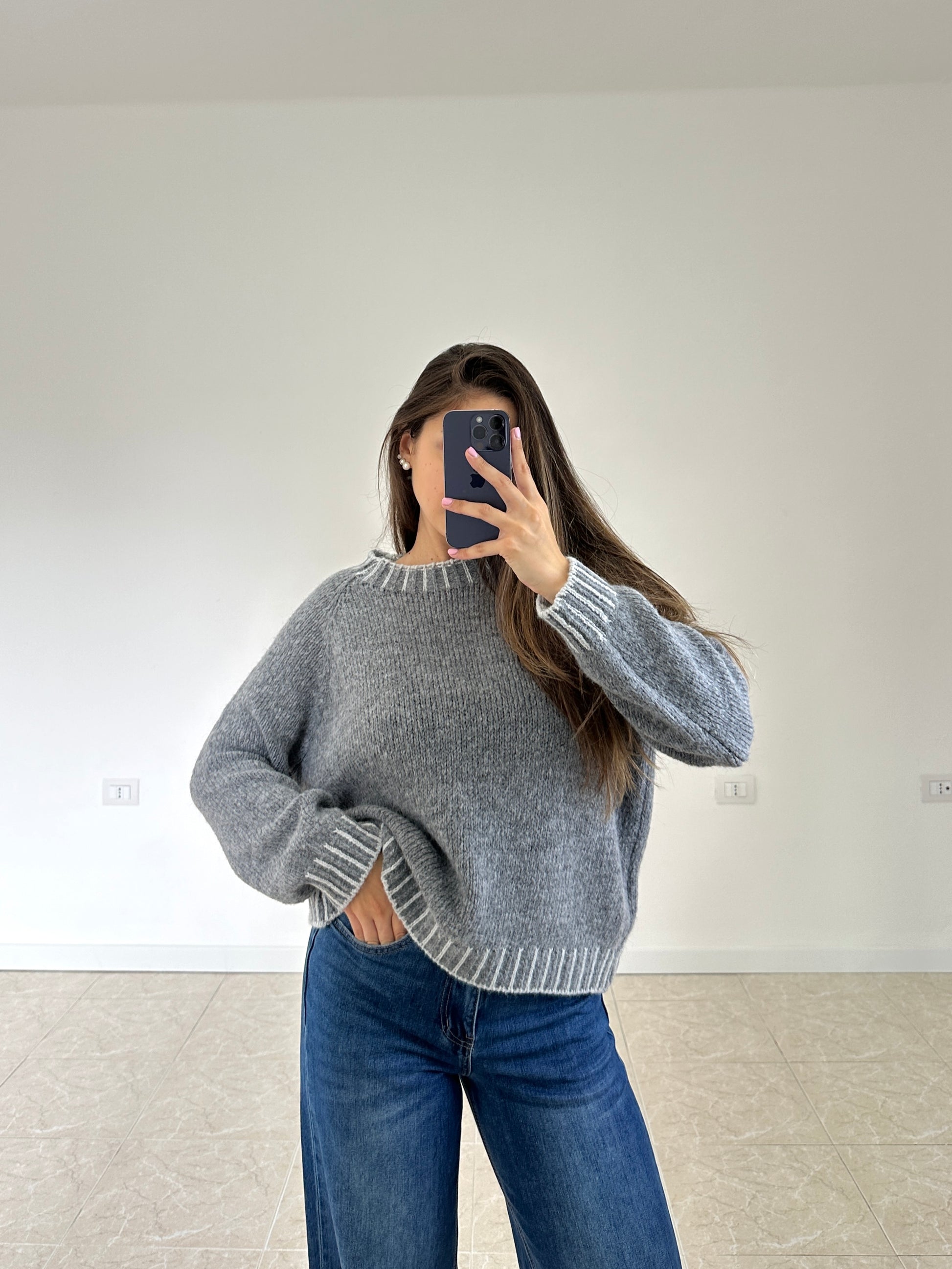 Maglione morbido con dettaglio a contrasto sui bordi del collo e delle maniche. Taglia unica, vestibilità fino ad una tg. 46.