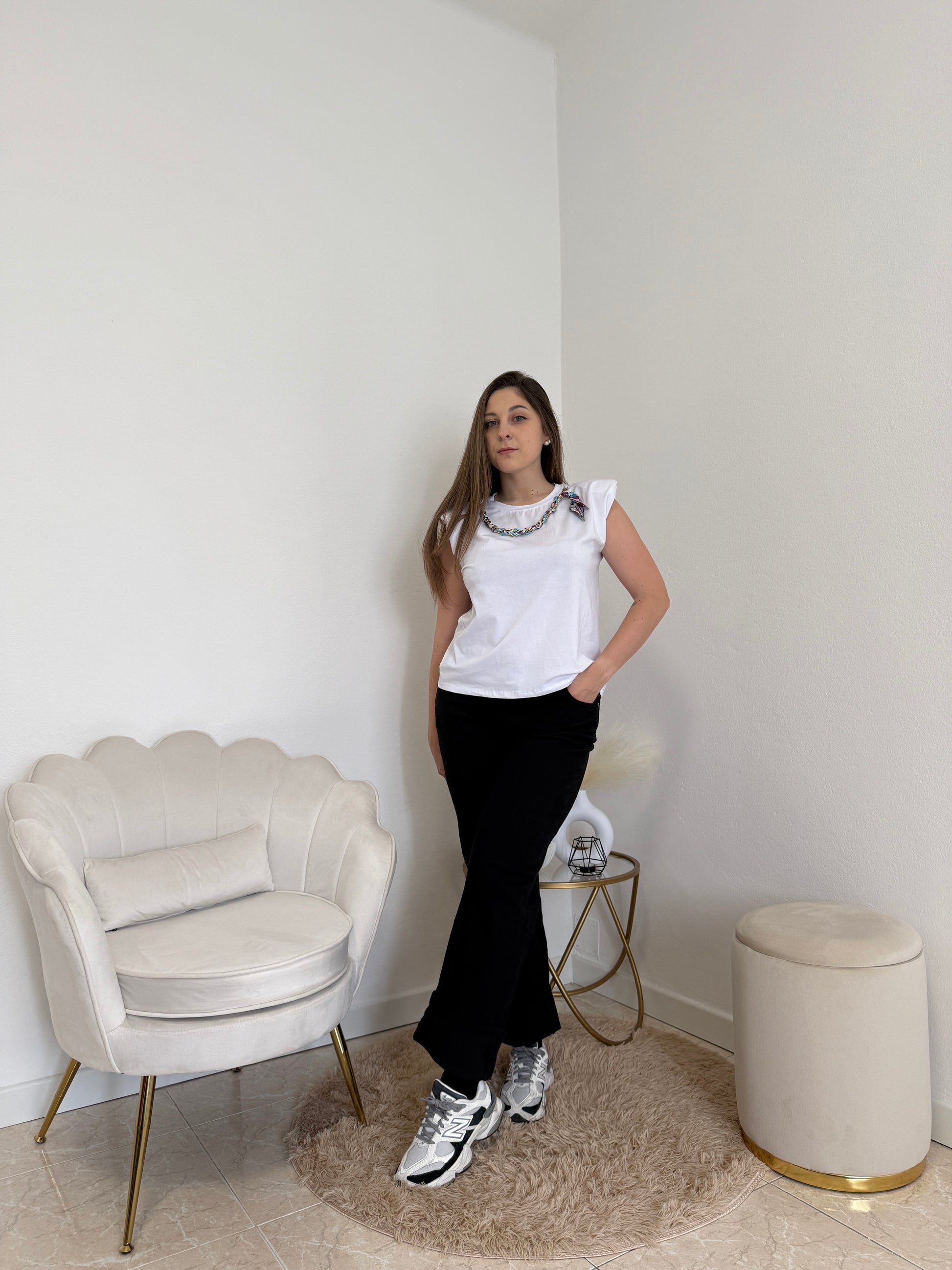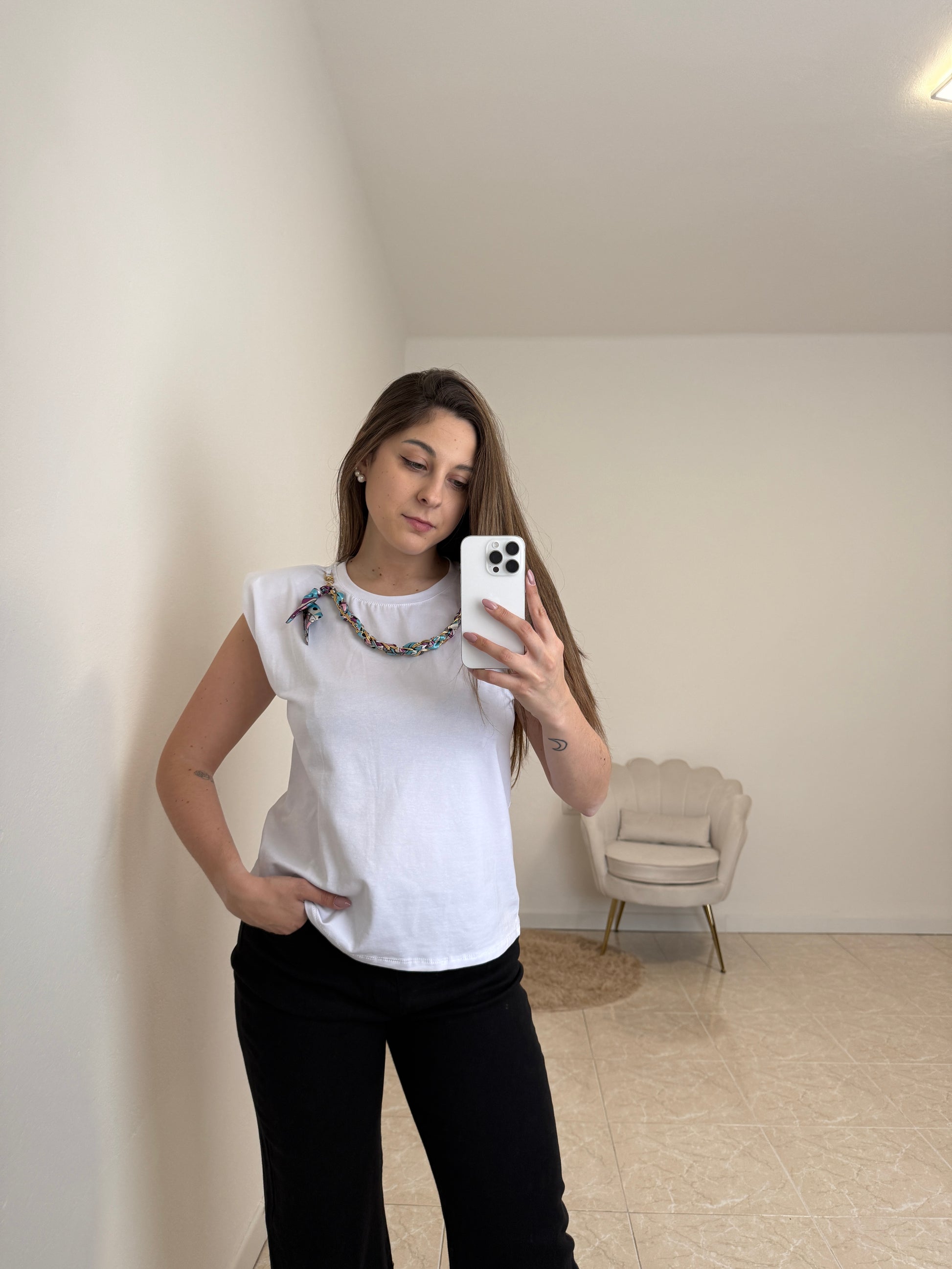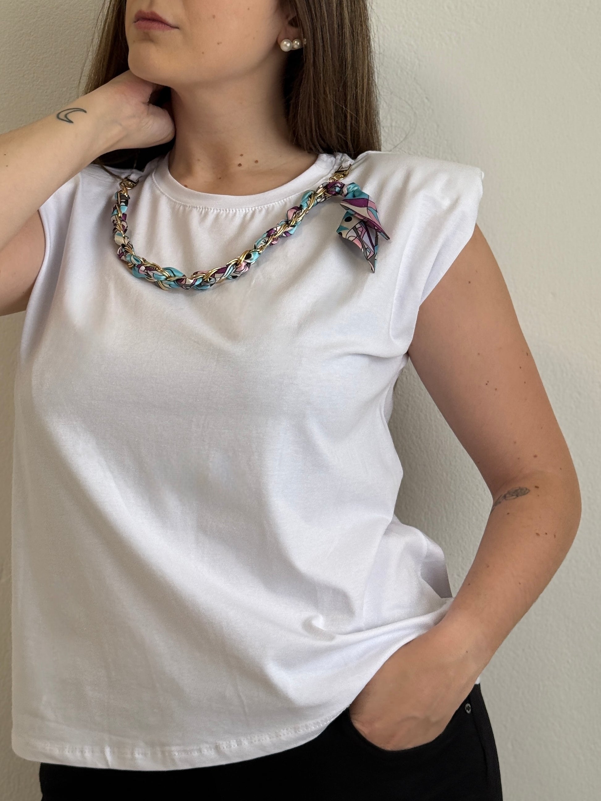 T-Shirt bianca con catena di foulard dorata. Spalline imbottite. Taglia unica, vestibilità fino ad una tg. 44.