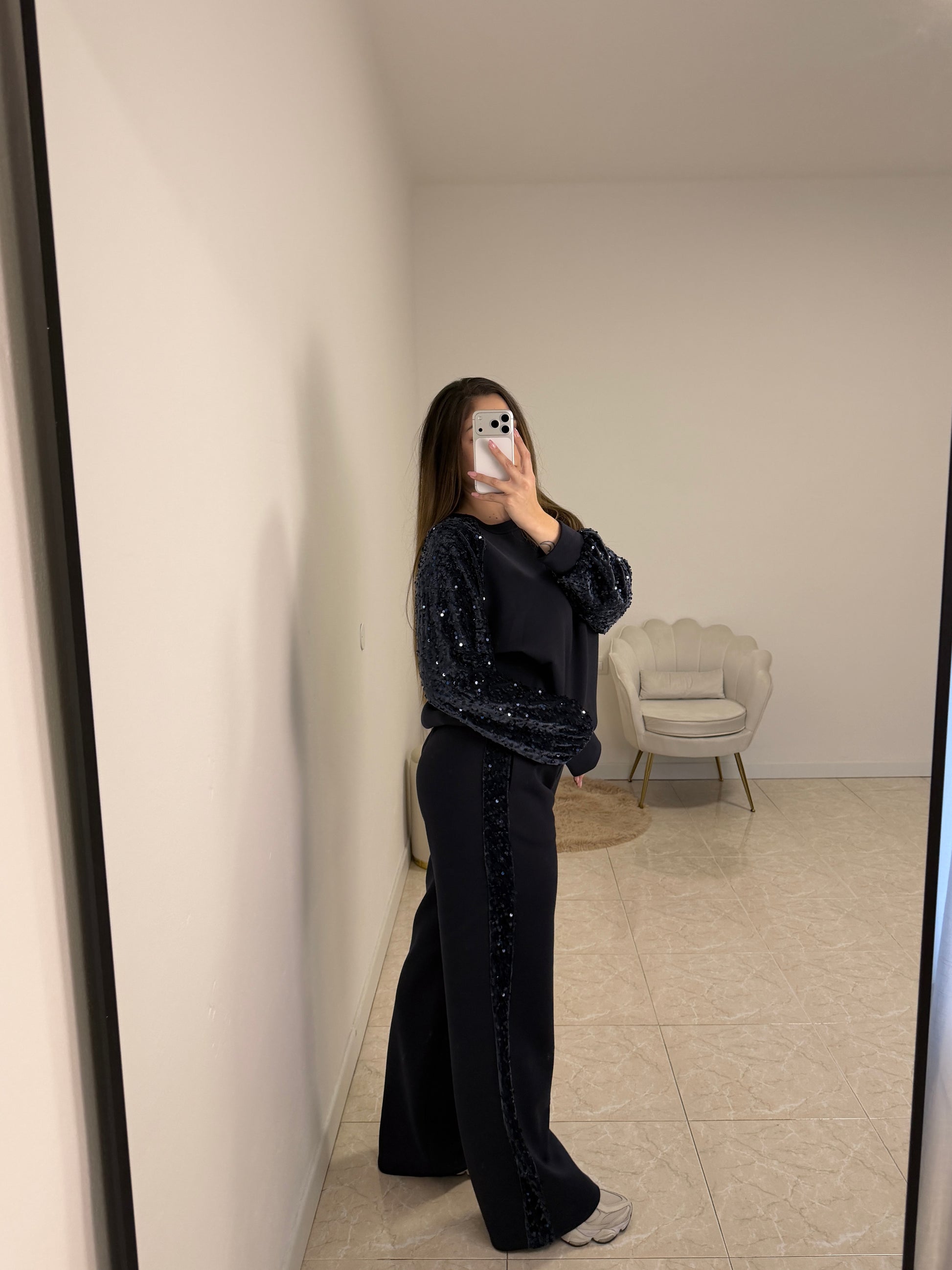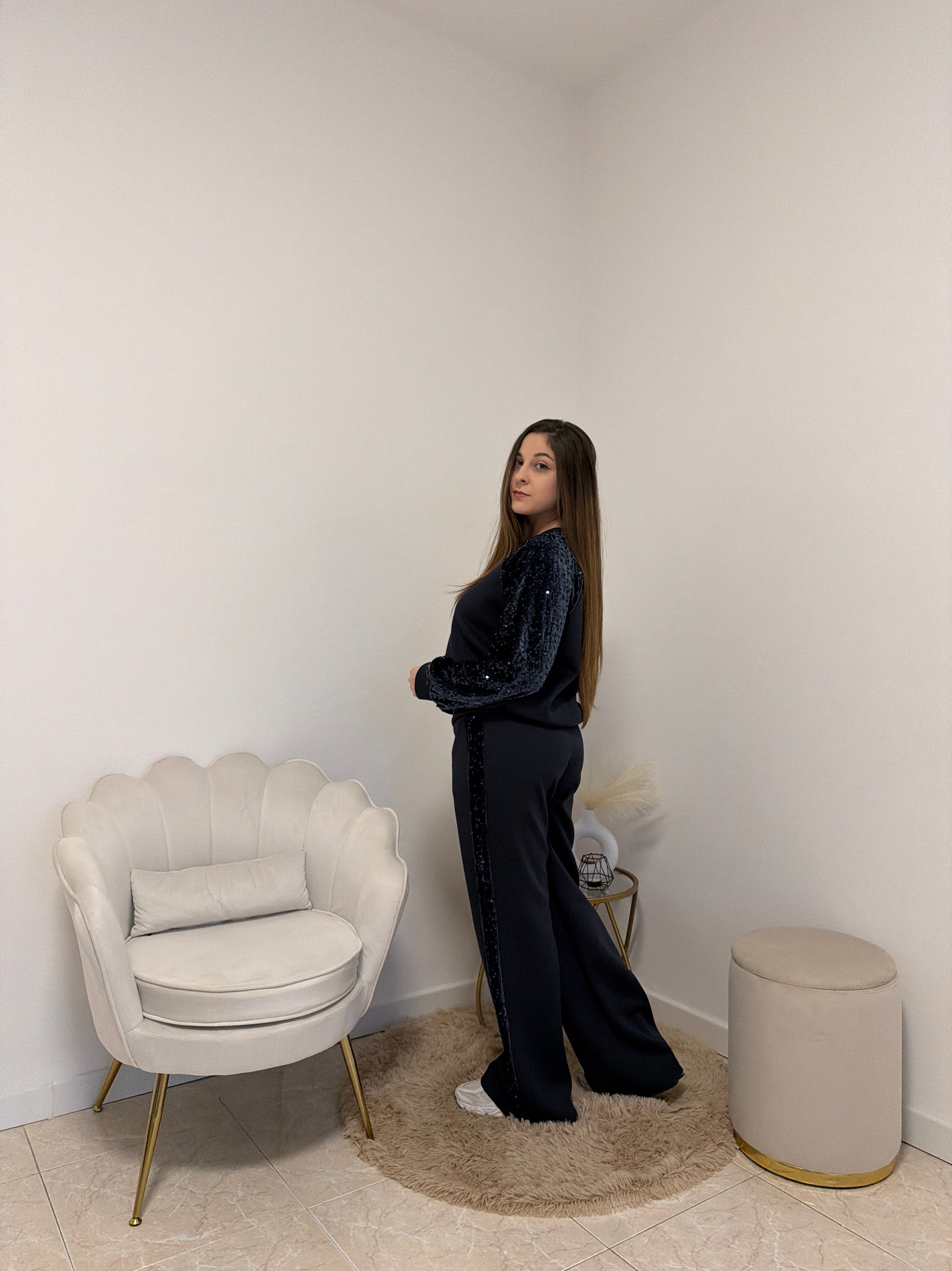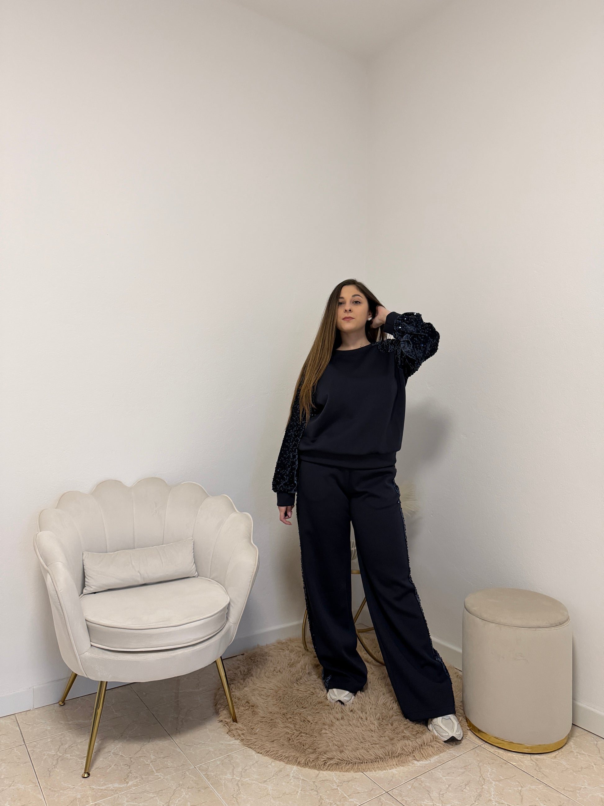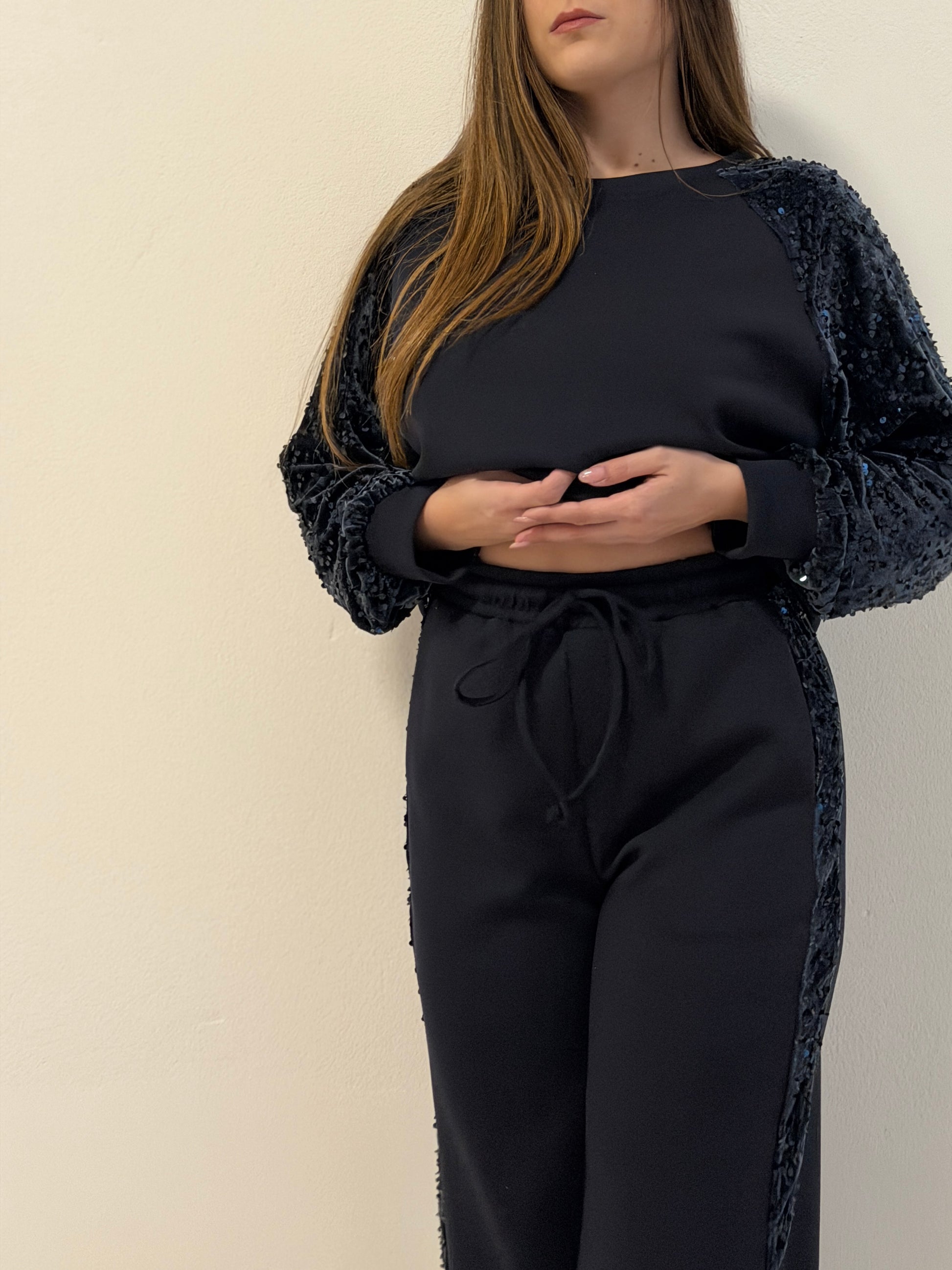 Tuta con inserti in velluto e paillettes sulle maniche e ai lati del pantalone. Pantalone modello a palazzo con tasche laterali, elastico e laccetto in vita. Taglia unica, vestibilità fino ad una tg. 46.