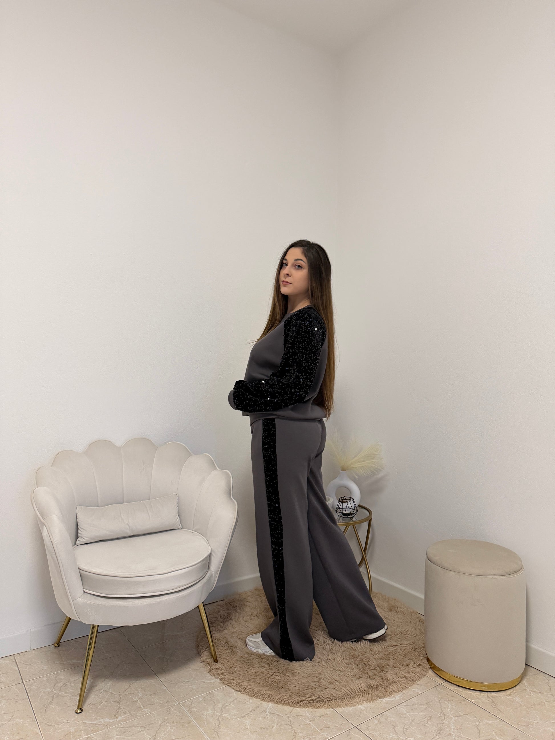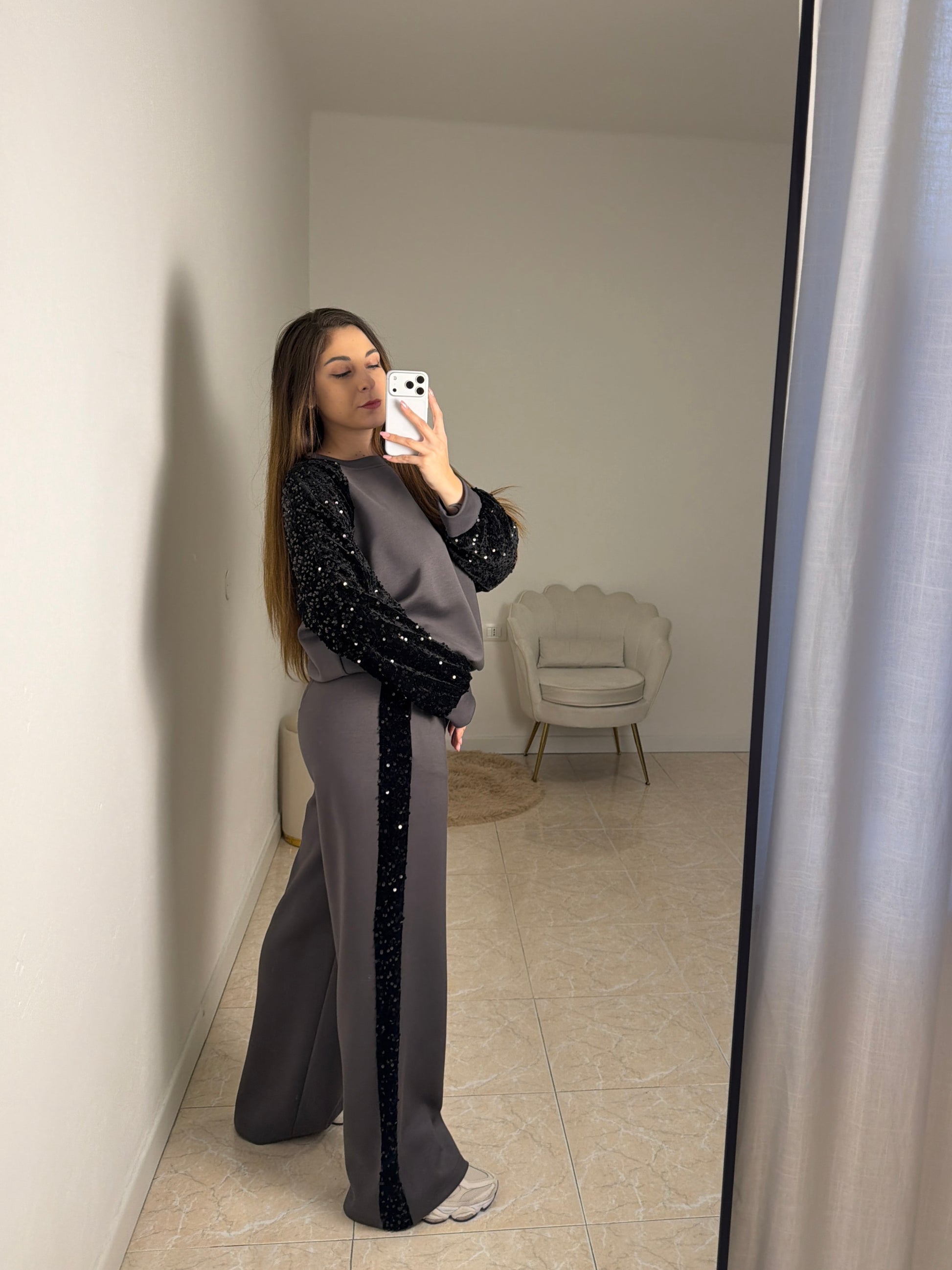 Tuta con inserti in velluto e paillettes sulle maniche e ai lati del pantalone. Pantalone modello a palazzo con tasche laterali, elastico e laccetto in vita. Taglia unica, vestibilità fino ad una tg. 46.